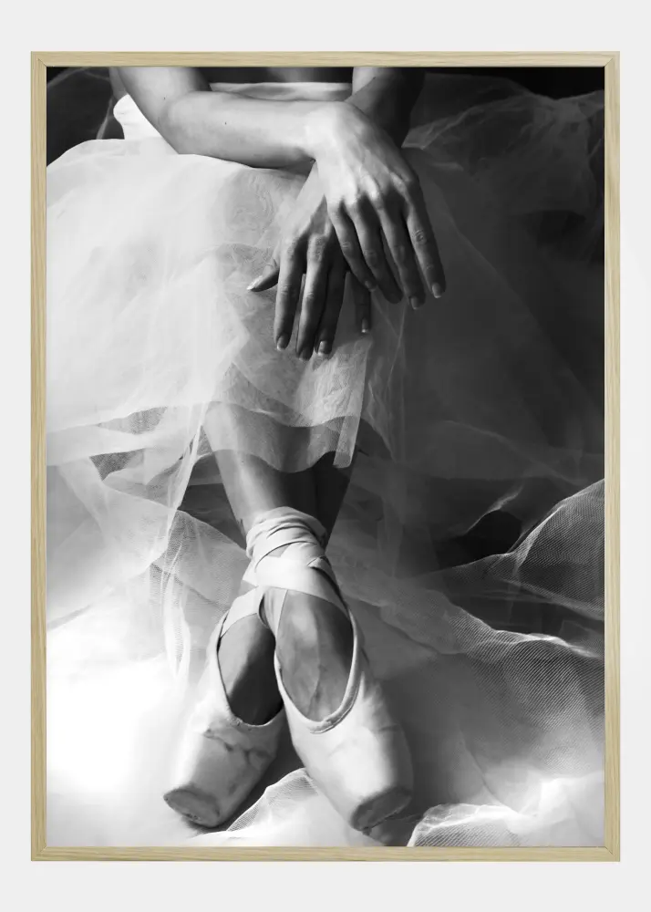 Une affiche élégante d'une ballerine posant assise avant une danse. Suivez les pieds et les mains croisés alors qu'elle attend son tour. Ce poster est parfait pour décorer un mur neutre.