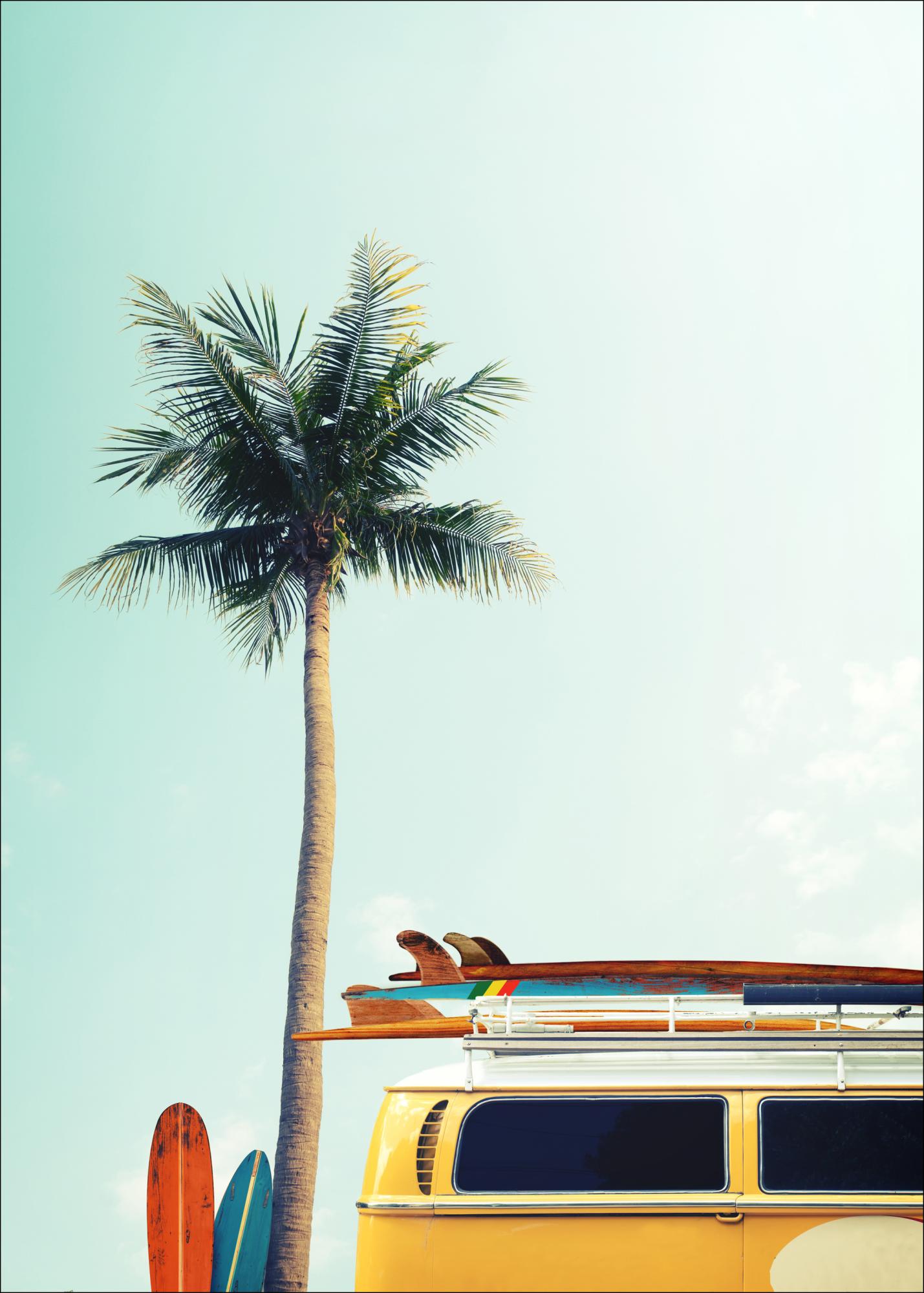 Un poster photographique avec le classique minibus Volkswagen et ses planches de surf, garé à côté d'un palmier sous un ciel sans nuage. Un poster coloré qui donne une merveilleuse sensation d'été et de liberté. Associez-le volontiers avec d'autres favoris sur un plus grand mur de tableaux.