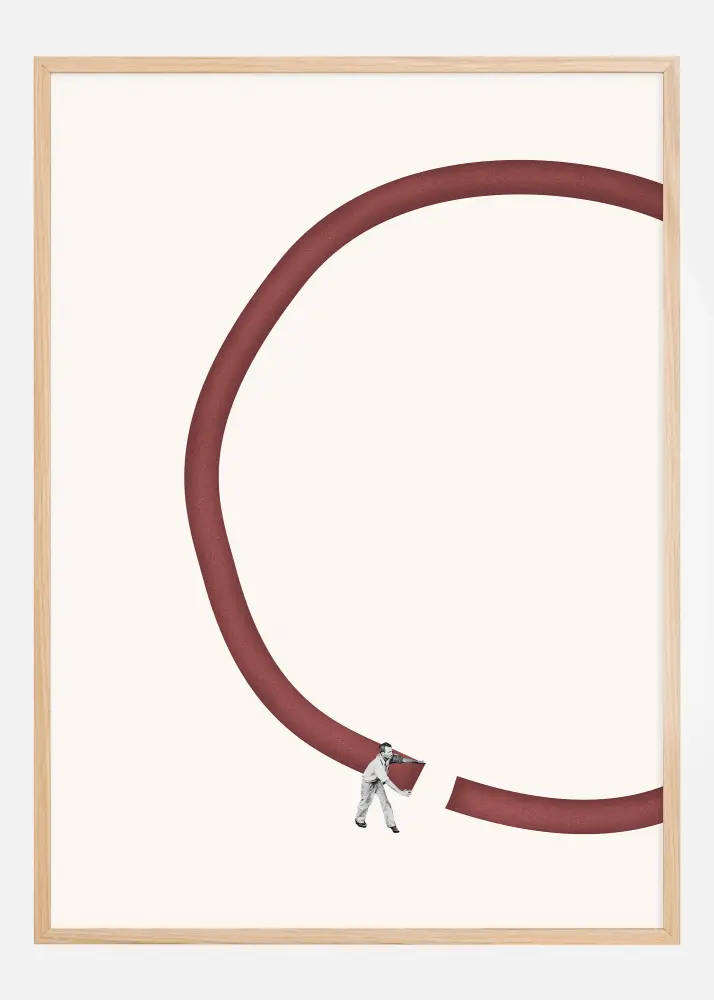 Cette affiche conceptuelle crée une intrigue visuelle immédiate avec sa composition abstraite. Une grande forme circulaire brun-rouge est rompue par une figure vêtue de blanc qui semble relier ou réparer la ligne brisée. L'utilisation minimale de couleurs et de figures donne une sensation de modernisme et d'œuvre d'art conceptuelle. Le fond blanc pur crée un contraste fort avec la couleur brun-rouge profond, mettant en valeur sa qualité graphique.