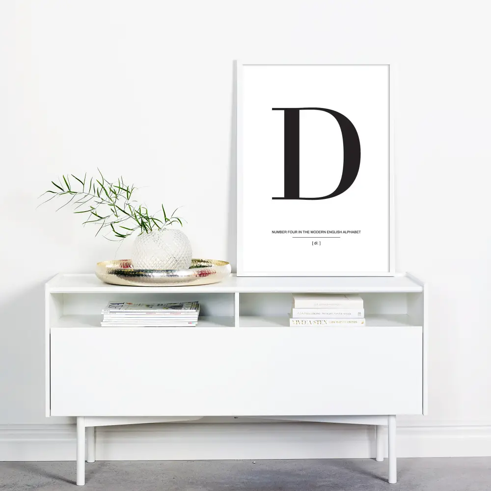 Dans la simplicité se trouve la beauté, et cela est vraiment prouvé par ce poster épuré avec la lettre D en noir sur un fond blanc. Le print a une typographie élégante et devrait être complété par d'autres posters de lettres de la même série pour créer un mur de cadres tendance et magnifique. Choisissez vos posters de lettres préférés et sélectionnez parmi notre large gamme de cadres de qualité, puis laissez libre cours à votre imagination sur les murs de votre maison.
