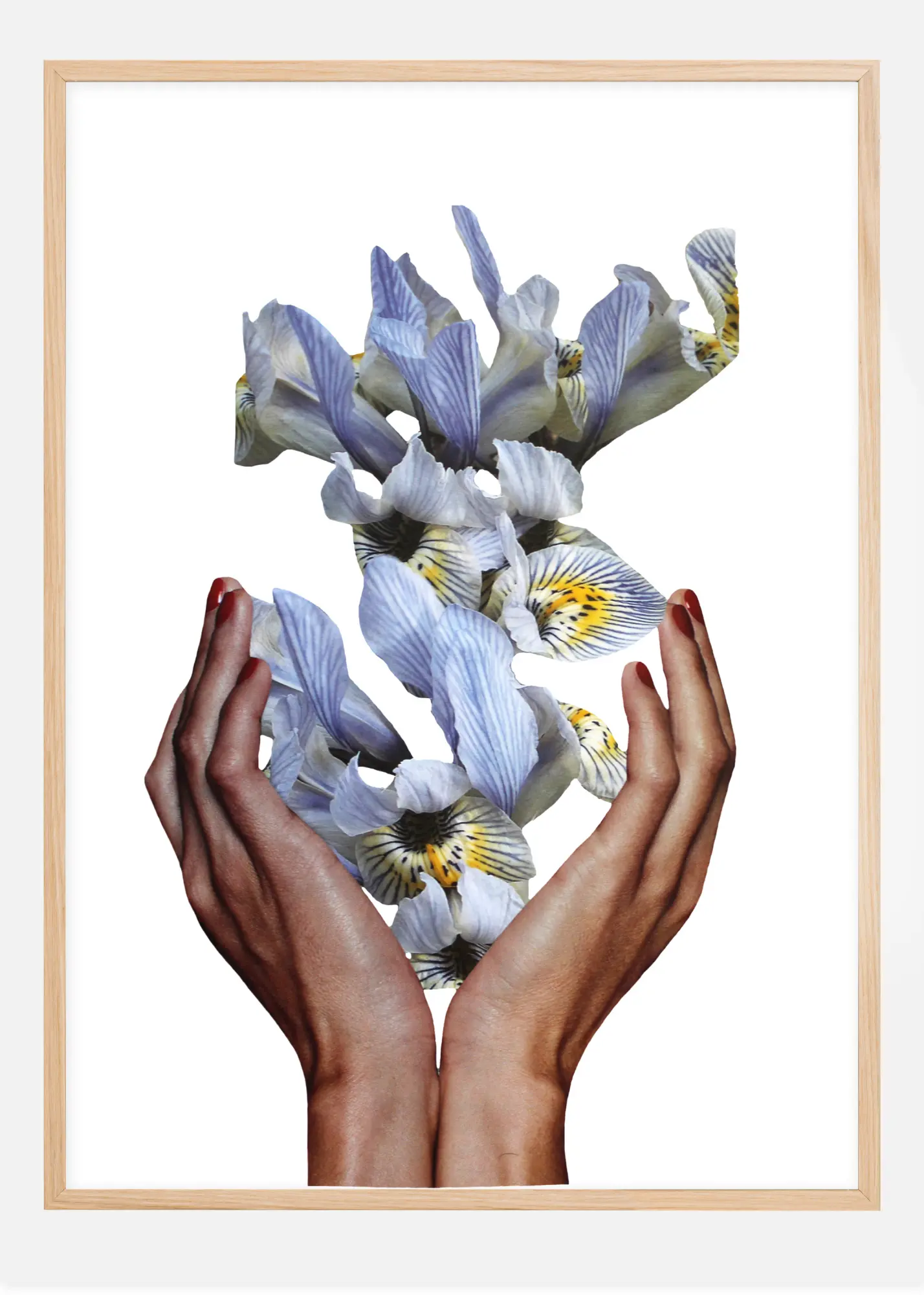 Une belle affiche florale d'iris mauves pâles. De délicates mains ouvertes aux ongles joliment vernis tiennent délicatement les iris. Le fond blanc met en valeur les doux mauves et jaunes pour créer une image florale délicate et magnifique. Un poster relaxant pour égayer un mur blanc.