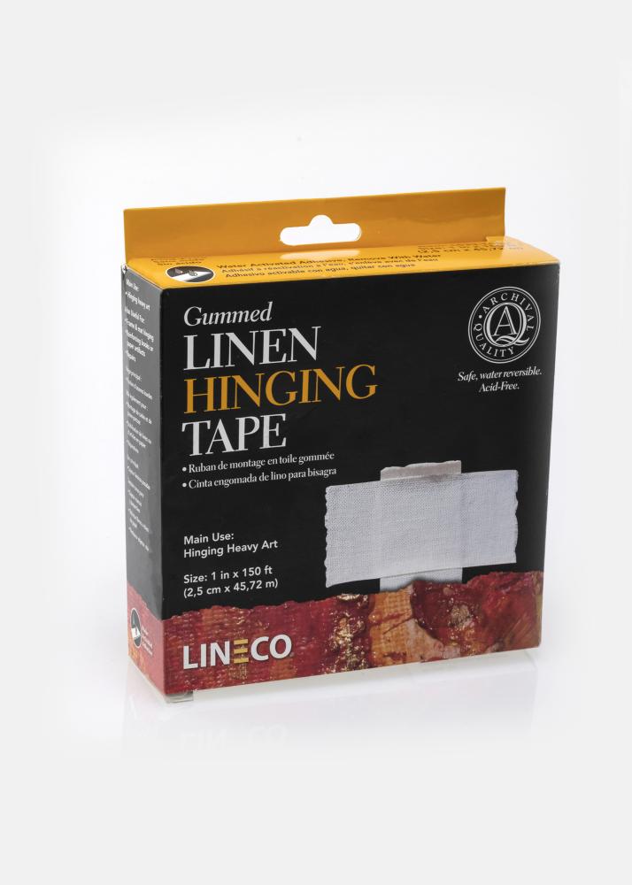Ruban en lin caoutchouté sans acide. Pour accrocher des œuvres d'art plus lourdes. Appliquez une pression sur la bande pendant 15 minutes avant de l'utiliser. 25 mm x 45,72 m, 63gm2.