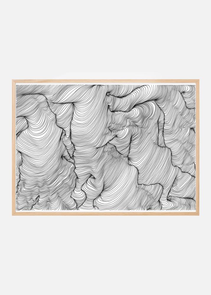 Un poster d'art abstrait en encre noire avec des lignes ondulées créant des formes excitantes, créé par Belinda Hellberg, Hells Bells Sthlm. Le motif est entouré d'un passe-partout blanc légèrement plus fin qui met efficacement en valeur son contenu. Un poster simple et élégant facile à combiner avec d'autres favoris sur un grand mur de tableaux.