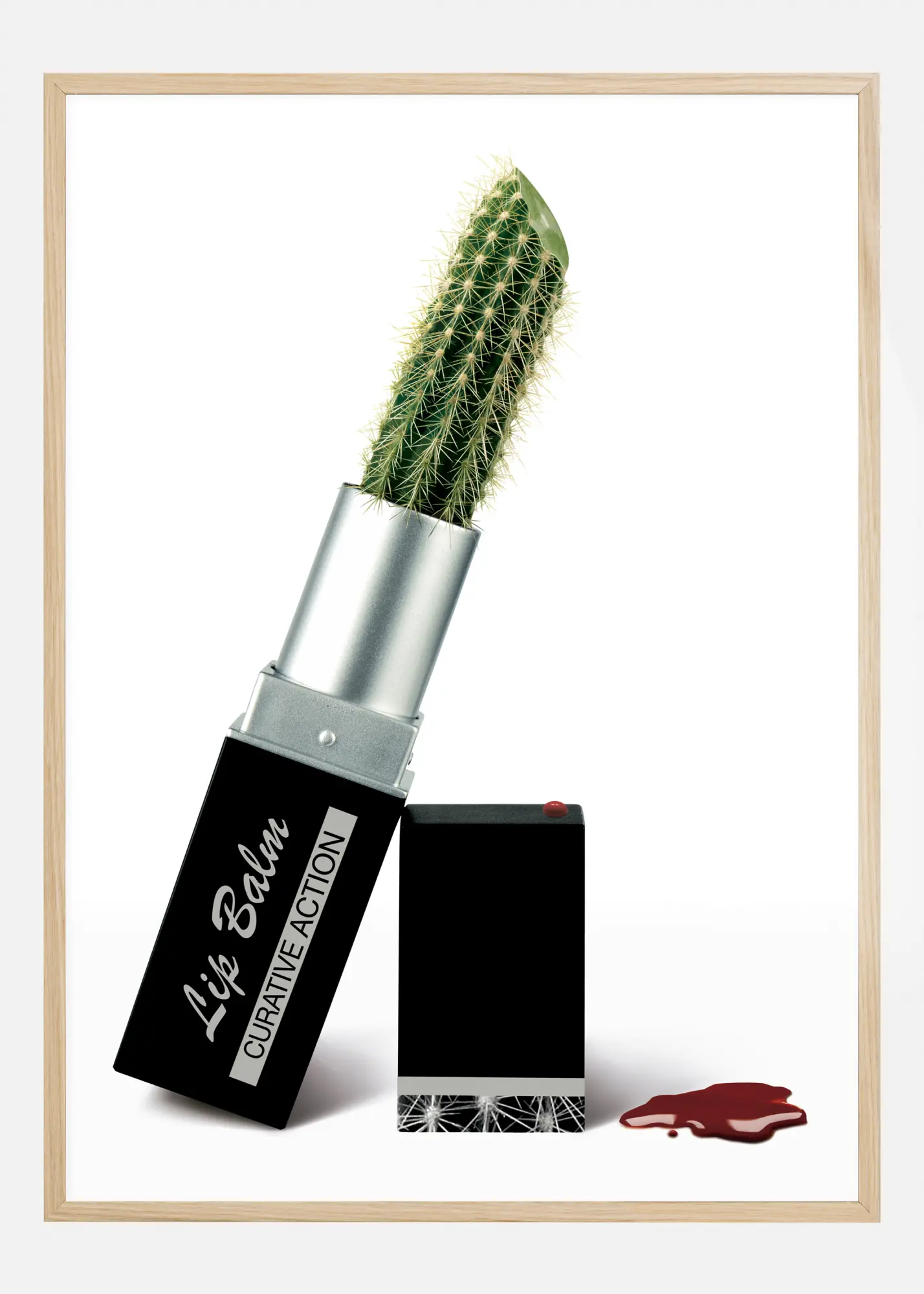 Une affiche de rouge à lèvres amusante. Sur une toile de fond blanche, un baume à lèvres en stick noir et blanc contient un cactus. Le bâton de baume étant appuyé sur son capuchon, on peut distinguer une minuscule goutte de rouge. Faites attention à ne pas vous piquer quand vous appliquez votre rouge à lèvres.