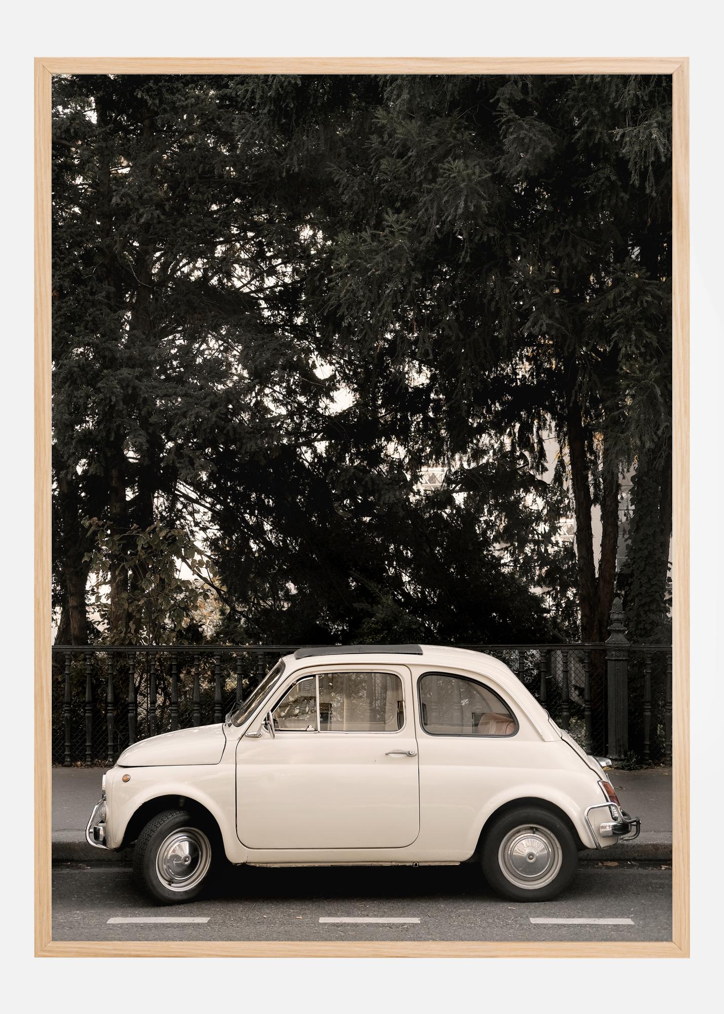 Dans cette affiche se reflète un équilibre parfait entre la surface blanche épurée du véhicule et les tons de vert plus foncé des arbres en arrière-plan, qui ensemble créent une image calme et harmonieuse. Le ciel teinté de sépia et l'environnement urbain subtil ajoutent une dimension supplémentaire de chaleur et de profondeur. Cette affiche ajoutera une touche de sophistication à n'importe quelle pièce, et est un cadeau idéal pour les passionnés de voitures ou pour ceux qui apprécient l'esthétique classique dans leur décoration intérieure.