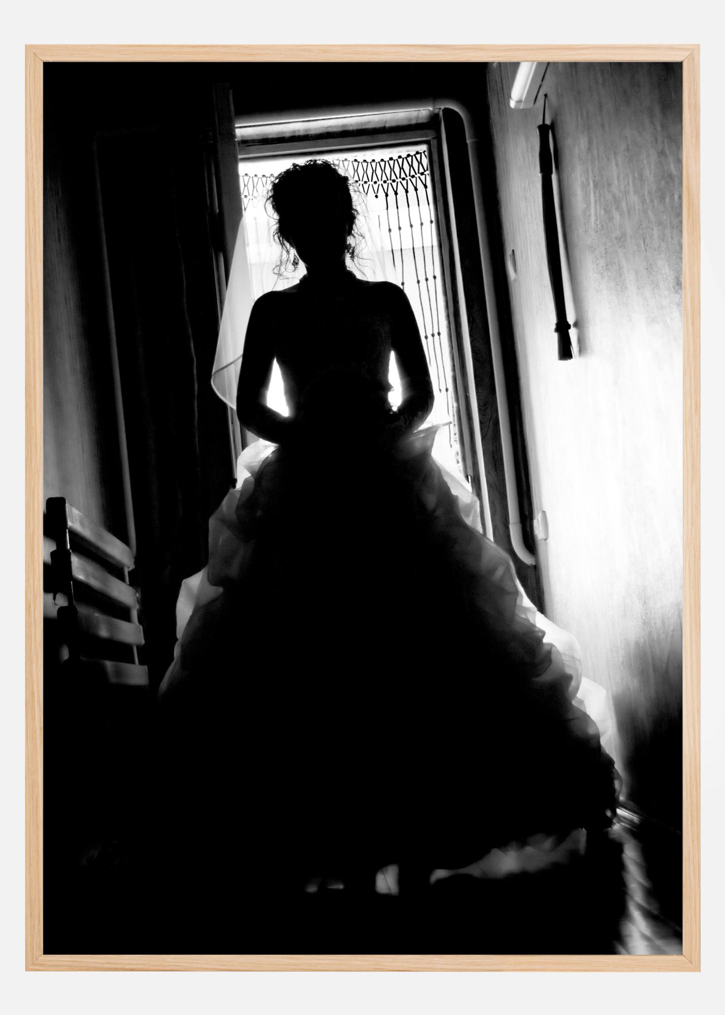 Art photographique en nuances de gris foncé d'une mariée photographiée en contre-jour. Un poster sombre et diffus qui crée de l'intérêt et de la curiosité. Associez-le volontiers avec d'autres favoris pour un mur de tableaux plus grand et plus vivant.