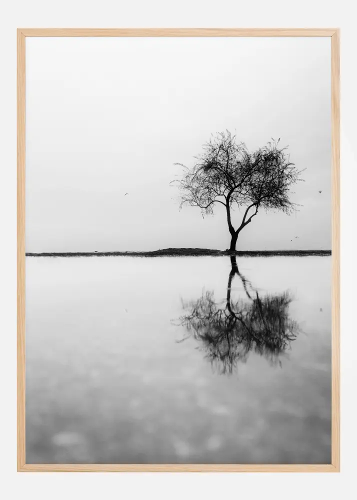 Une affiche étonnante en noir et blanc d'un arbre solitaire debout dans l'eau. La ligne d'horizon gris clair met en valeur la silhouette sombre de l'arbre, créant un sentiment de solitude. Ressentez le silence en accrochant ce tirage dans votre maison.
