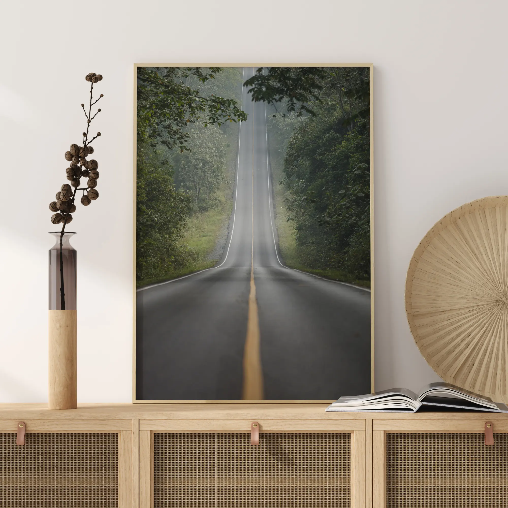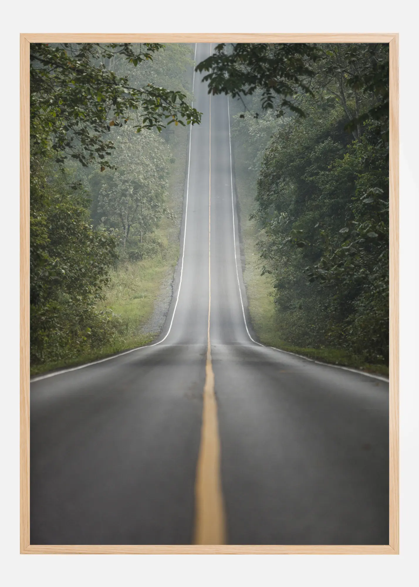 Une belle affiche nature représentant une route solitaire qui traverse le centre des bois. La longue route rectiligne traverse le milieu des bois verts en mettant en valeur l’unique ligne jaune au centre de l'image. Un poster simple qui vous interroge : mais où va donc cette route grise ? .