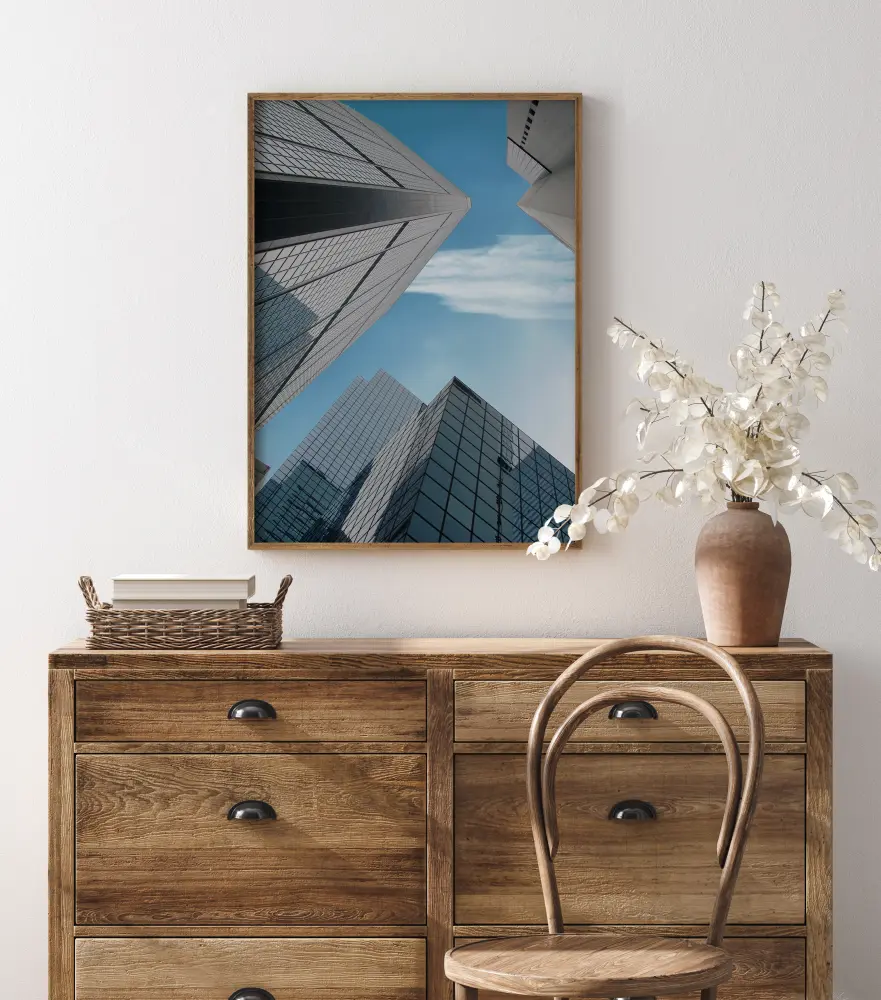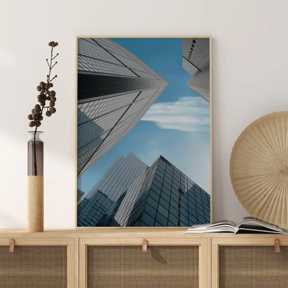 Une affiche architecturale à couper le souffle représentant des bâtiments aux panneaux en miroir. Pris de bas en haut, ce tirage donne une impression de grandeur. Le magnifique ciel bleu clair avec un seul nuage blanc ajoute une touche de couleur supplémentaire à ce magnifique poster. Parfait dans une petite pièce pour ajouter un sentiment d'immensité.