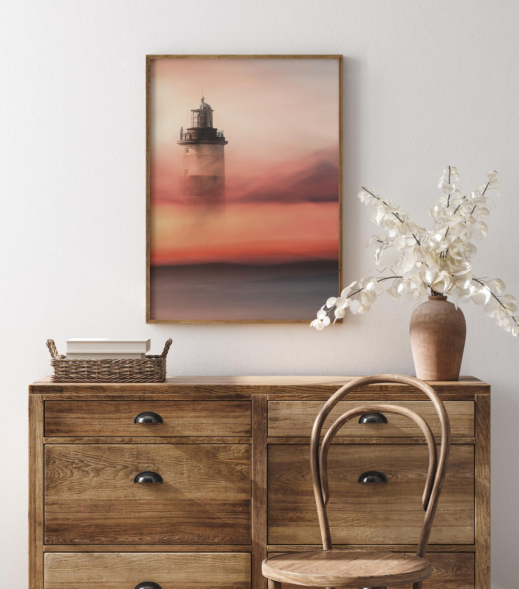 Une belle affiche romantique d'un phare dans la brume de la mer. Les couleurs pastel douces et roses créent un sentiment d’amour, tandis que la mer aux couleurs bleues douces ajoute un ton plus sombre à cette belle impression. Sentez et entendez la brise marine en accrochant cette impression dans votre maison.