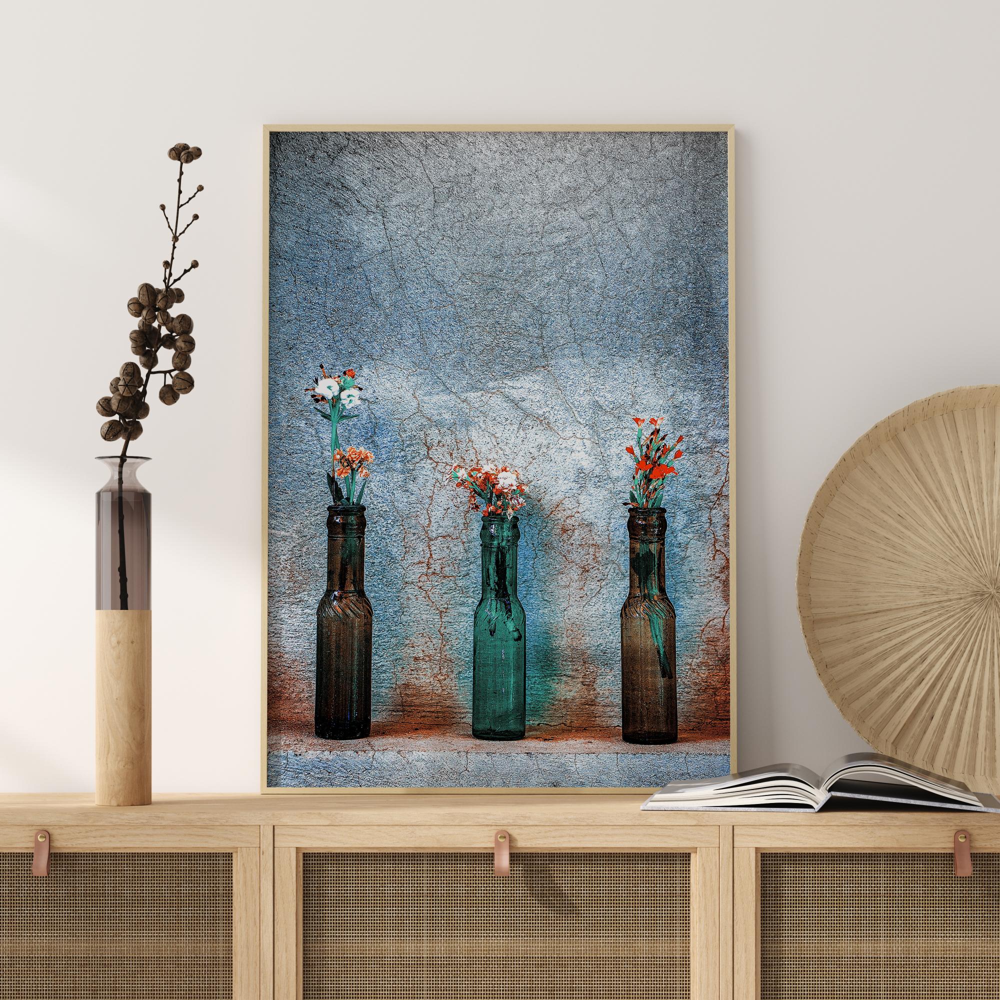 Une belle affiche de trois bouteilles en verre sur une surface en pierre. Chaque bouteille contient de petits bouquets de fleurs colorées. Les veines brunes des pierres mettent en valeur les ombres des bouteilles qui se reflètent sur l'étagère en pierre. Une peinture simple mais délicate à accrocher sur un mur blanc pour ajouter une touche de couleur supplémentaire.