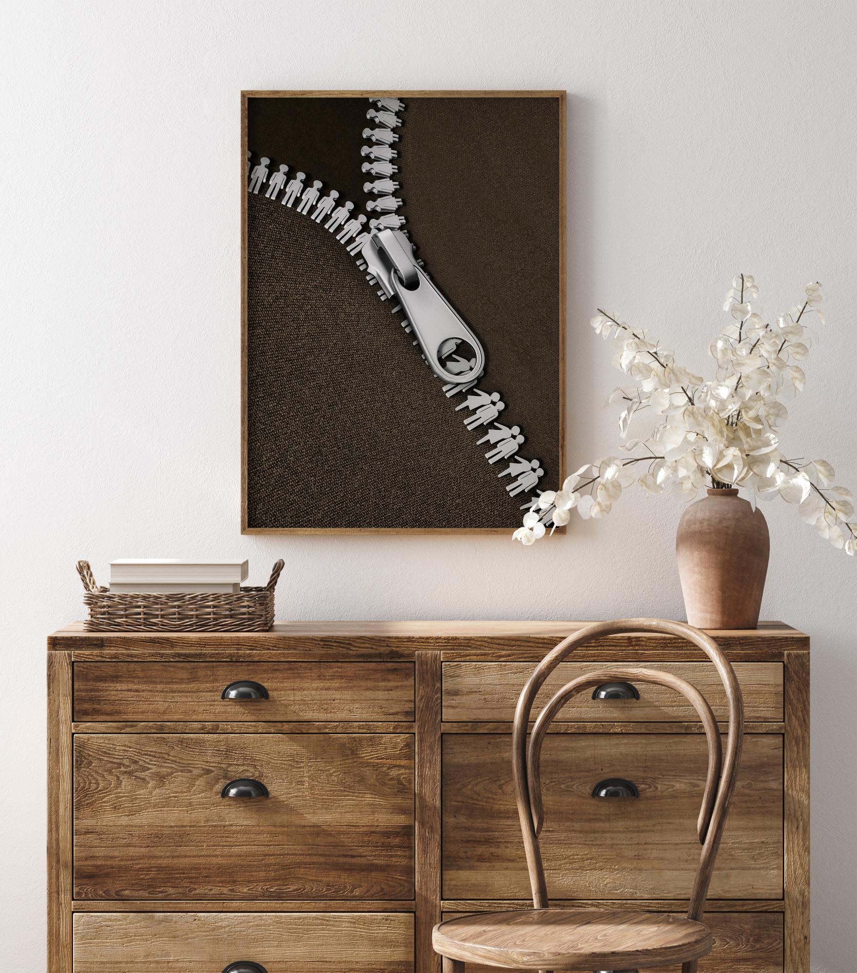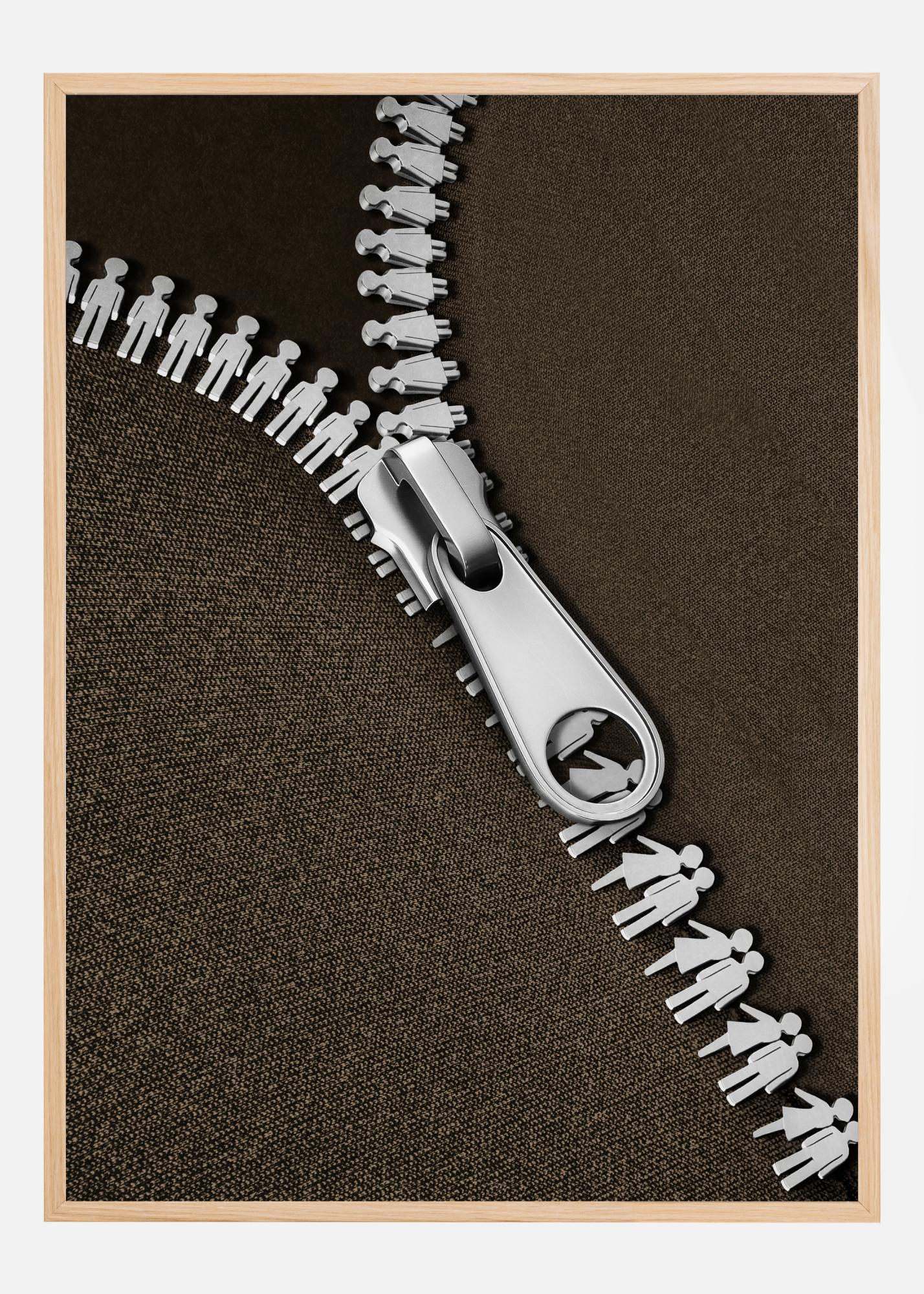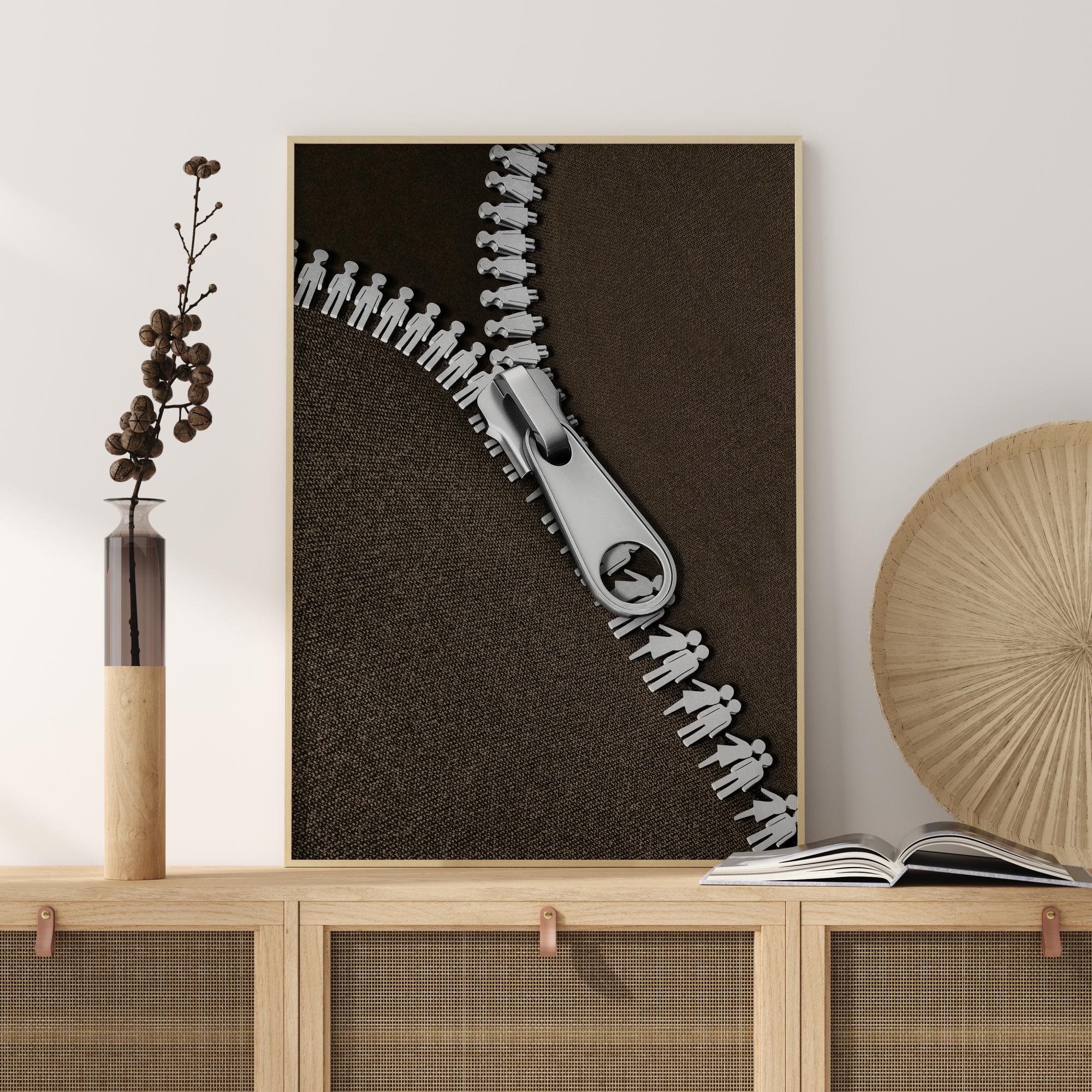 Une affiche minimaliste d'une fermeture éclair de couleur argentée. Sur un fond noir, la fermeture éclair représente la rencontre de deux amoureux. Sur un tissu marron foncé, le fermoir argenté est suspendu au-dessus des chiffres de la fermeture éclair. Une image amusante pour toute personne intéressée par la mode.