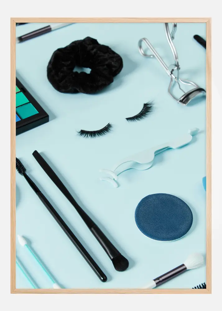 La palette de couleurs est dominée par des nuances de bleu douces et apaisantes, complétées par du noir et de l'argent, offrant un look frais et contemporain. Les détails réalistes des pinceaux de maquillage, du recourbe-cils et des faux cils contrastent magnifiquement avec le fond minimaliste, et la texture de l'élastique noir apporte un élément visuel intéressant. Cette impression sera un excellent ajout à la salle de bain, à la coiffeuse ou à tout endroit où la beauté et le style sont de la plus haute importance. Elle est parfaite pour inspirer et égayer votre rituel de beauté quotidien.