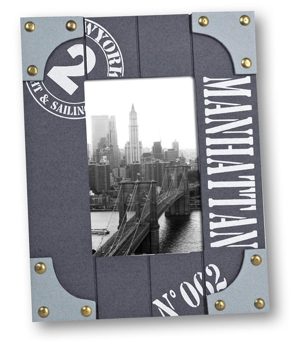 Cadre d'inspiration rétro sur fond gris foncé avec des références claires à New York et à Manhattan. Ce cadre est de design unique avec ses coins en relief gris clair ornés d'élégants rivets en laiton.