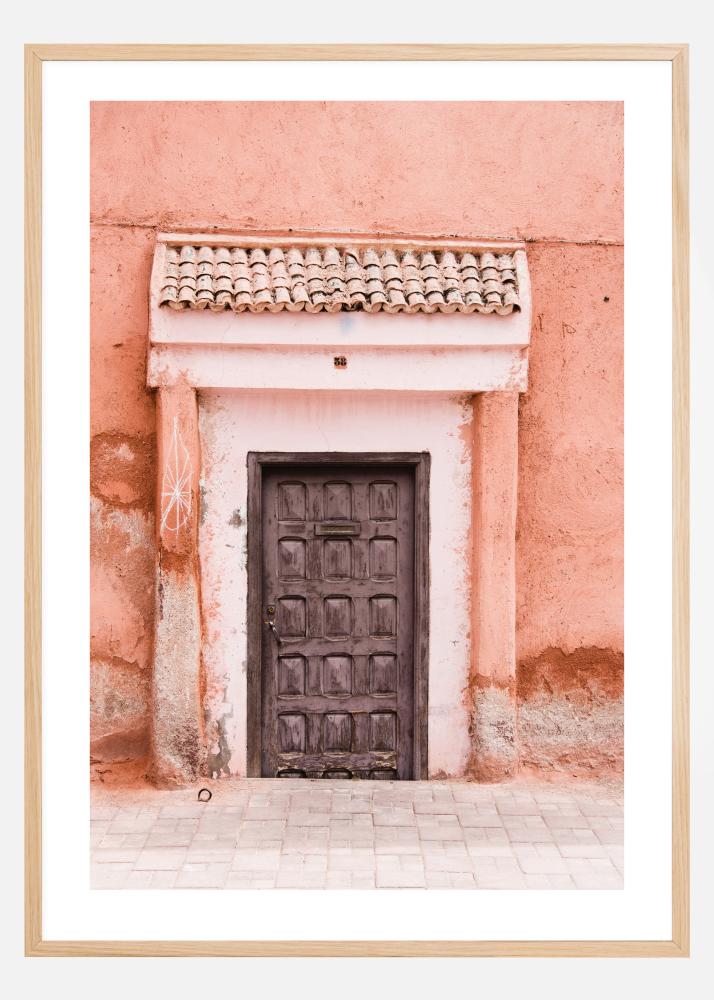 Une belle affiche d'une porte d'entrée en bois. La maison marocaine est peinte en couleur pêche. Le mur blanc qui entoure la porte donne une touche de lumière supplémentaire au tableau. Accrochez ce magnifique poster couleur pêche à un mur beige pour créer un sentiment d'harmonie.