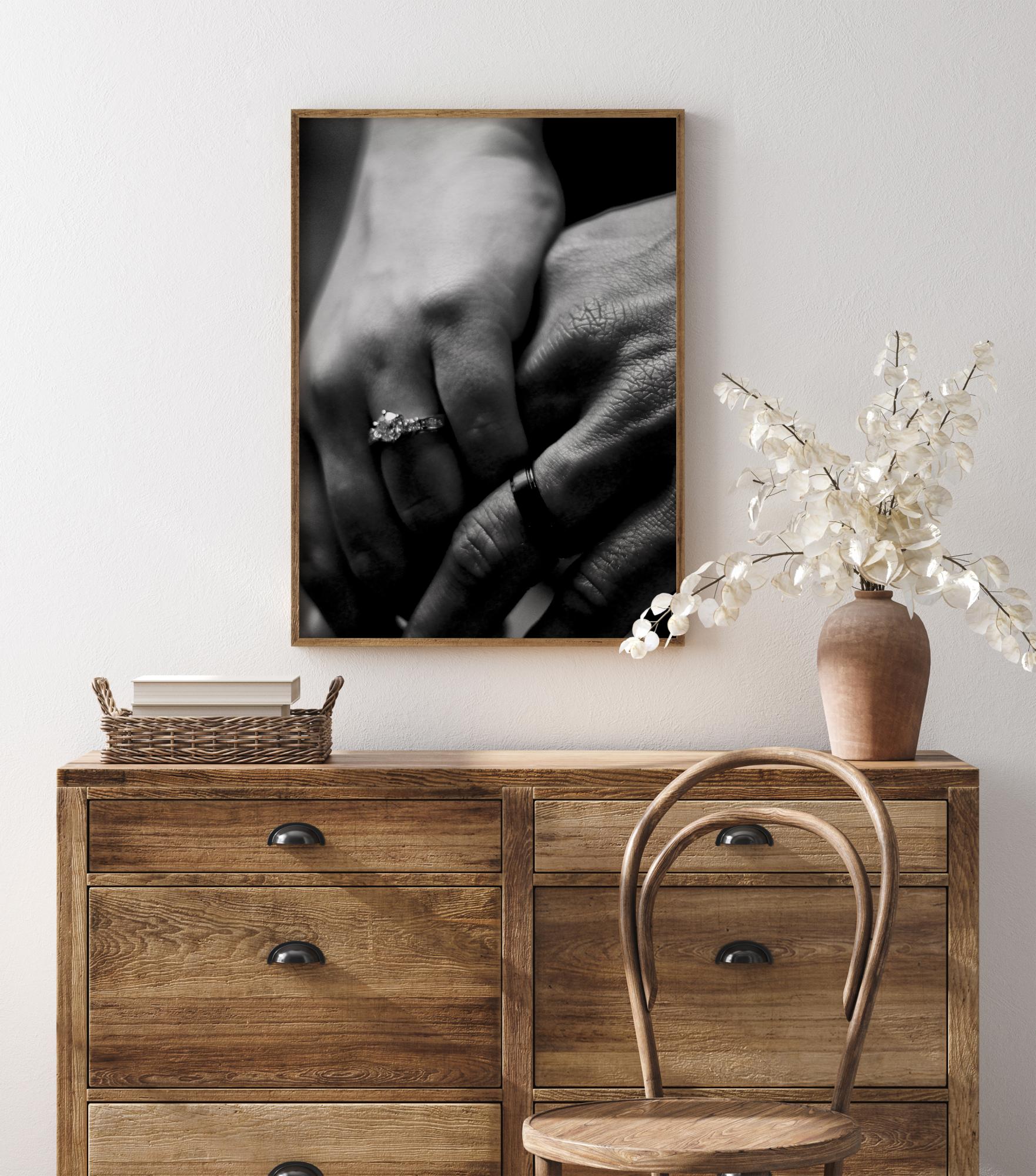 Une affiche romantique en noir et blanc de deux mains portant des bagues. Une image forte et émotionnelle sur un fond sombre. La lumière naturelle éclaire la petite bague en forme de diamant. Un poster romantique à accrocher au mur d'une chambre à coucher.