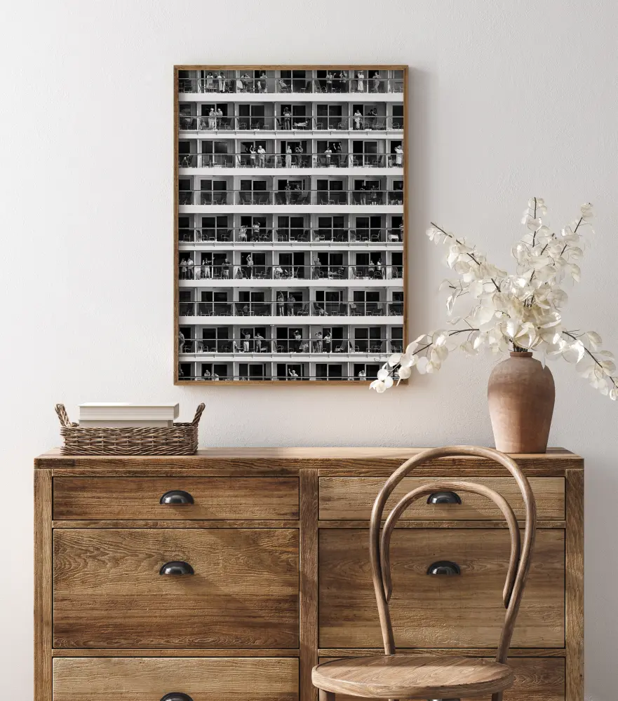 Une affiche géométrique de voyage montrant des rangées de balcons avec des personnes profitant du soleil. Laissez-vous envahir par l'amour en saluant tous les visages amicaux de cette photo touristique imaginative.