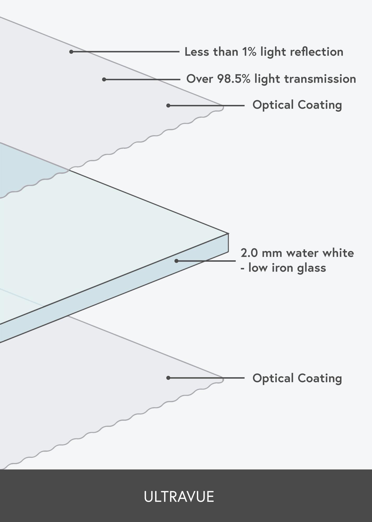 Évitez les reflets gênants avec un véritable verre antireflet de chez Tru Vue. Avec un taux de réflexion de seulement 1 %, le verre est presque invisible et donne à vos images des couleurs naturelles et un lustre réaliste. De plus, le verre est anti-UV et élimine 92 % des rayons UV nocifs, ce qui donne une plus grande longévité à vos images. UltraVue est également résistant aux rayures.