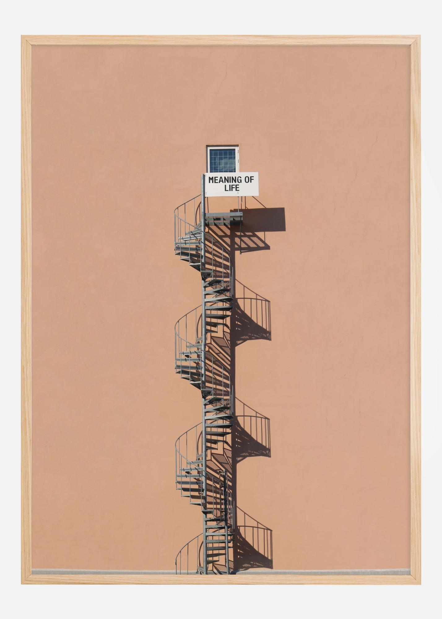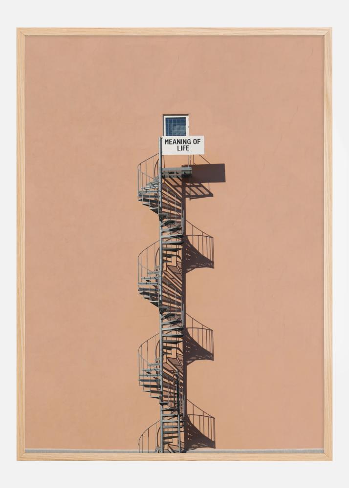Contre le fond minimaliste, uniformément coloré, l'escalier se distingue comme une structure à la fois physique et symbolique, où chaque marche peut représenter une expérience, un apprentissage ou une période de la vie. La position de la pancarte au sommet suggère que le sens de la vie est peut-être quelque chose que nous cherchons constamment, mais que nous ne pouvons peut-être jamais complètement saisir ou comprendre.