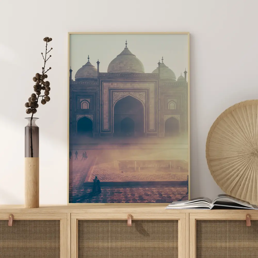 Le centre spirituel du monde musulman se dresse avec assurance au-dessus de la place au premier plan. Un petit groupe de personnes parcourt la place à travers un brouillard persistant et lumineux. La plus grande des entrées de la mosquée est flanquée de plus petites à gauche et à droite. Une affiche paisible pour créer une atmosphère apaisante.