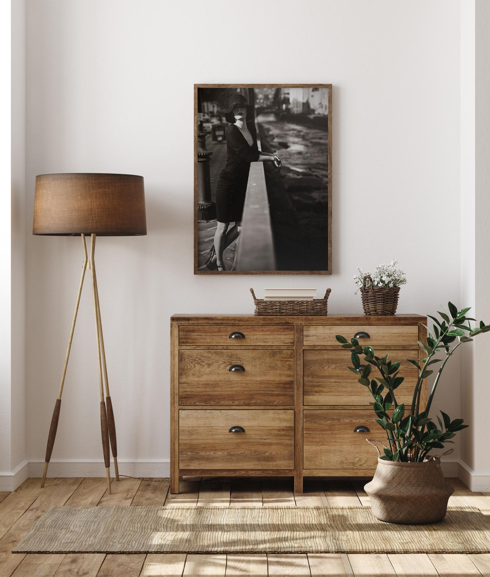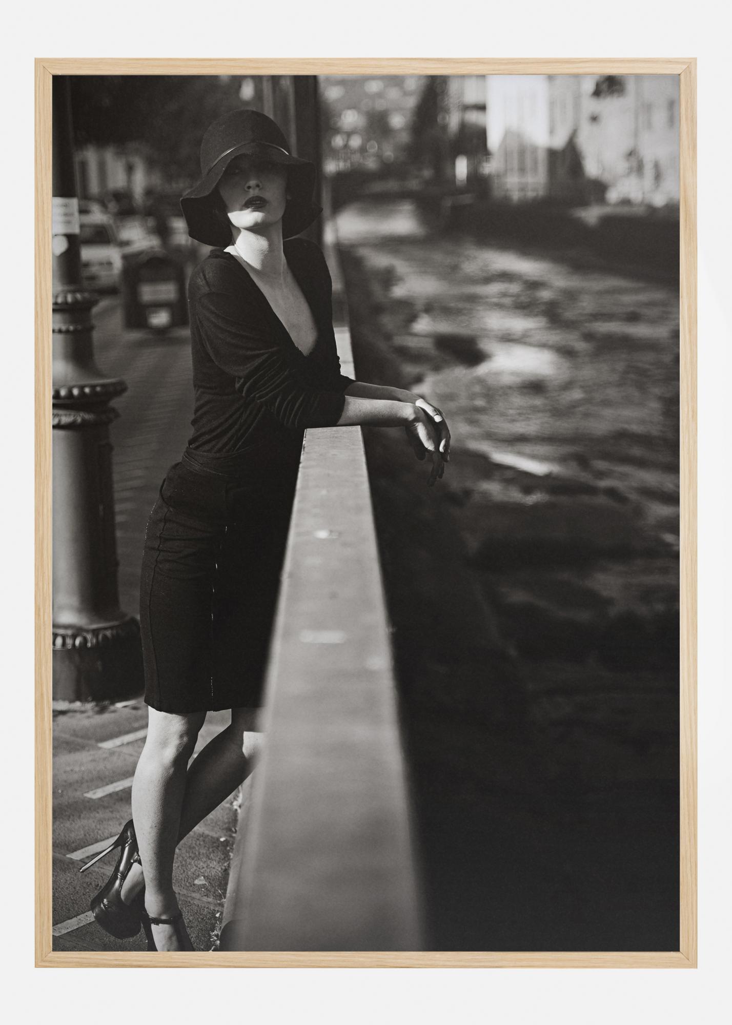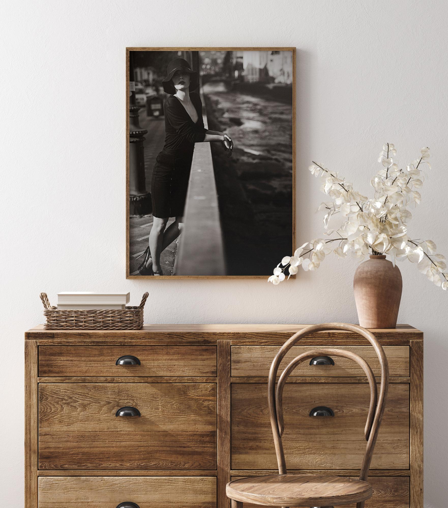 Un portrait d'une dame appuyée sur un mur. Pleine de classe et de chic, cette fabuleuse photo capture l'élégance décontractée comme rien d'autre. Ajoutez cette affiche à votre mur pour lui donner un air des années 30.