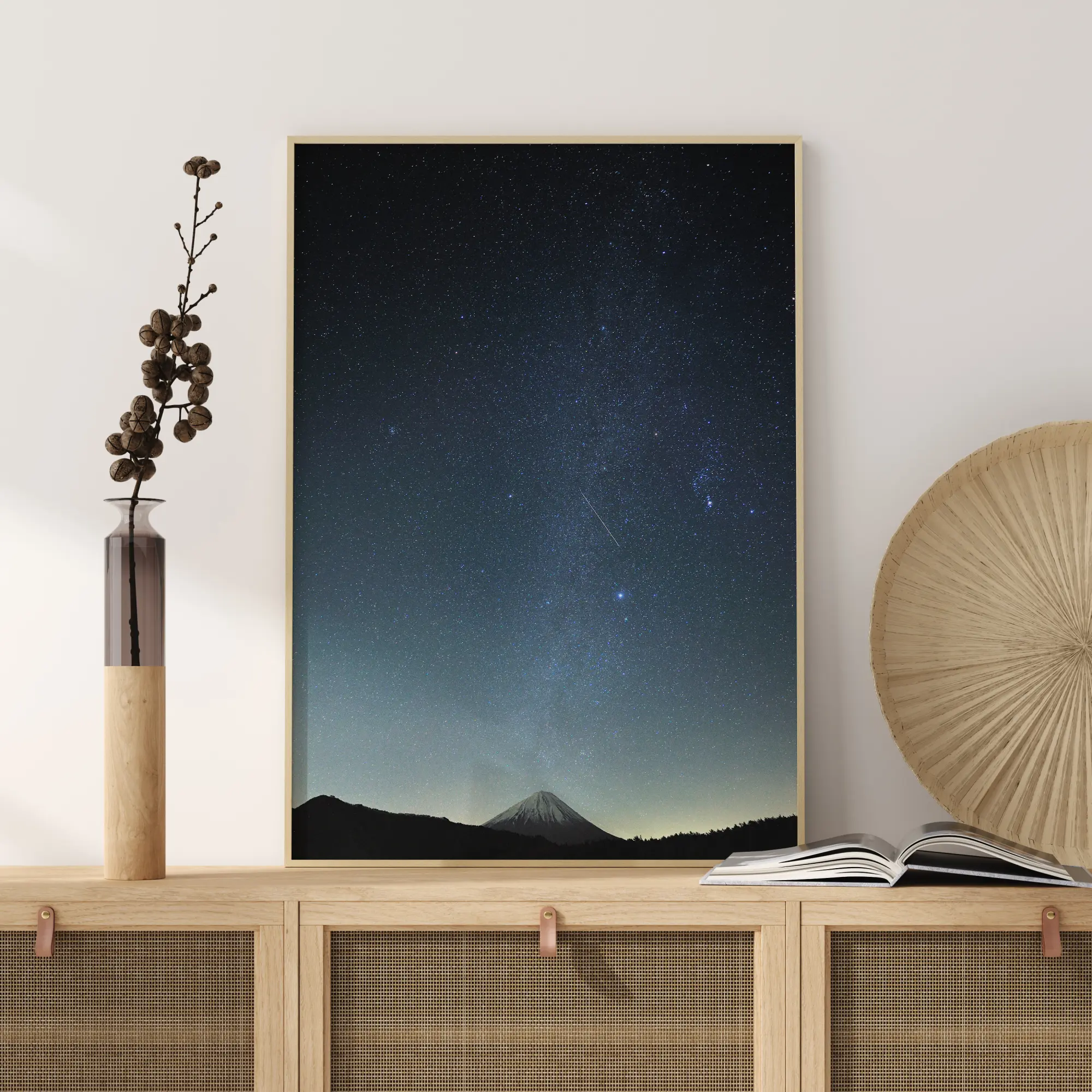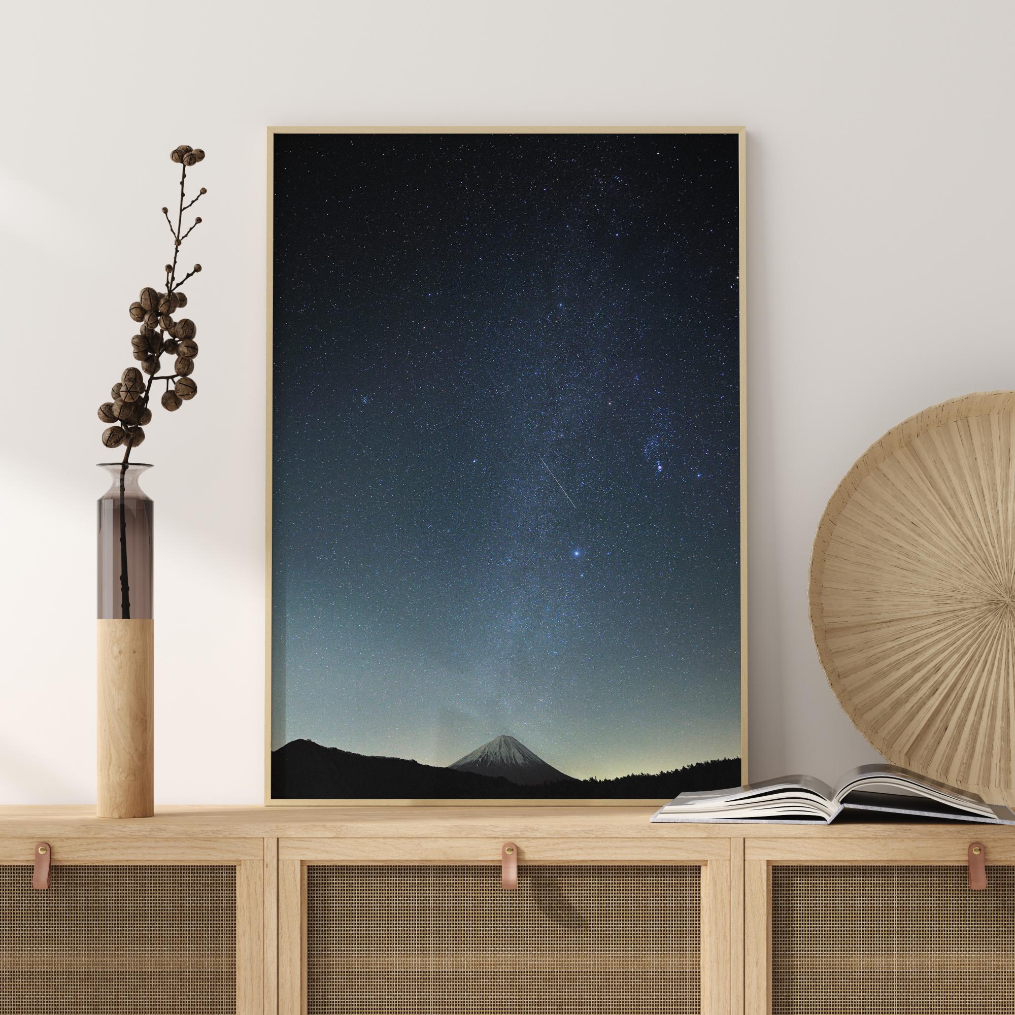 Une belle affiche de la nuit des météores. Avec une montagne enneigée au loin, il y a un sentiment mystique autour des étoiles blanches magiques. Un rayon de lumière naturelle jaillit de derrière la montagne, créant ce sentiment magique et mystique. Idéal pour une chambre d'enfant.
