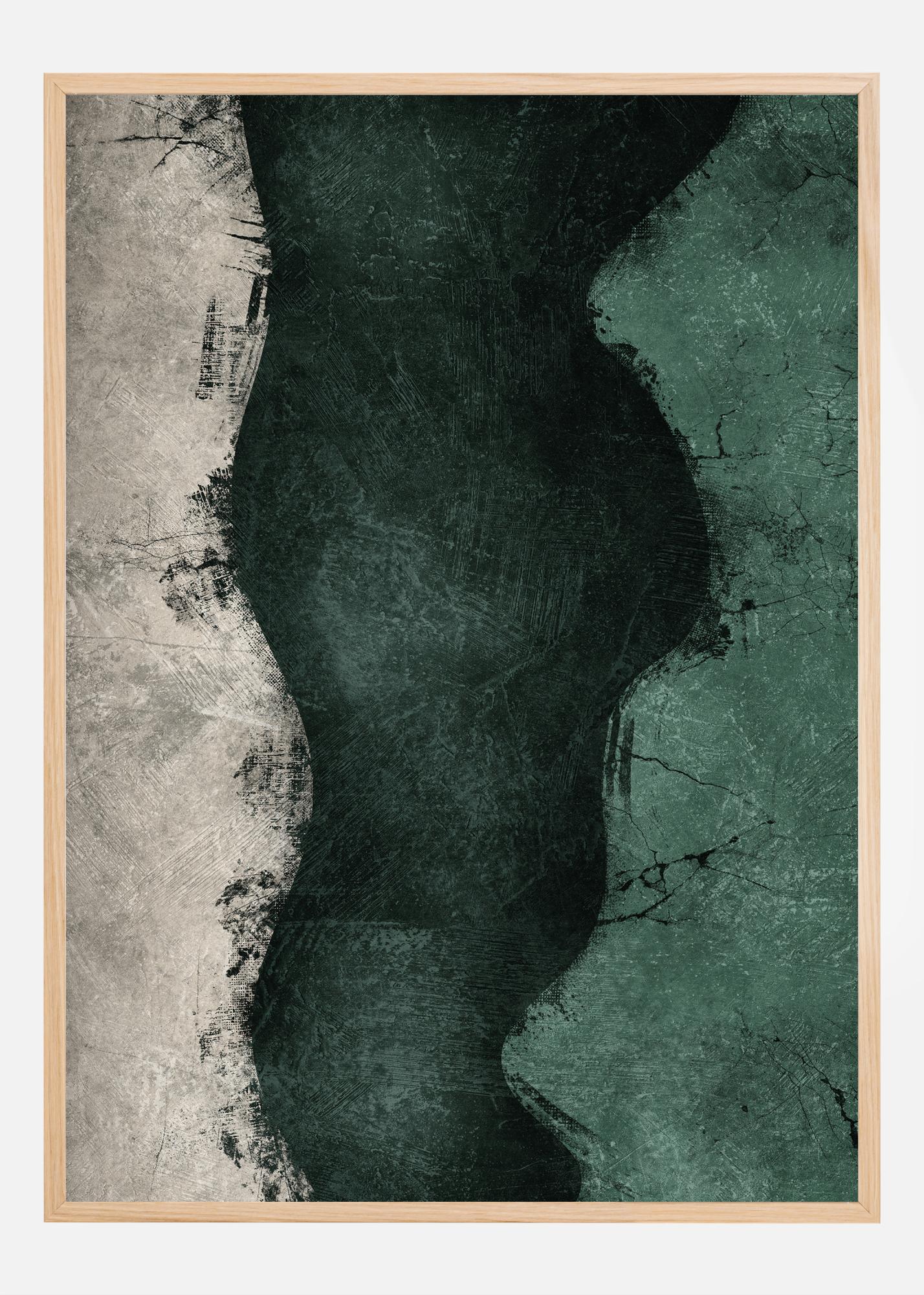 Cette affiche offre un fort impact visuel avec sa composition divisée de formes texturées, semblable à une image aérienne d'un paysage sombre ou une faille entre deux mondes. Un côté montre une teinte d'un vert intense avec des textures profondes, et l'autre une nuance plus pâle contrastante qui ensemble donnent une sensation de contraste dynamique de la nature entre forêt et espace ouvert. C'est une image dramatique et captivante qui joue avec les ombres et la lumière, créant un sentiment à la fois de mystère et de fascination.