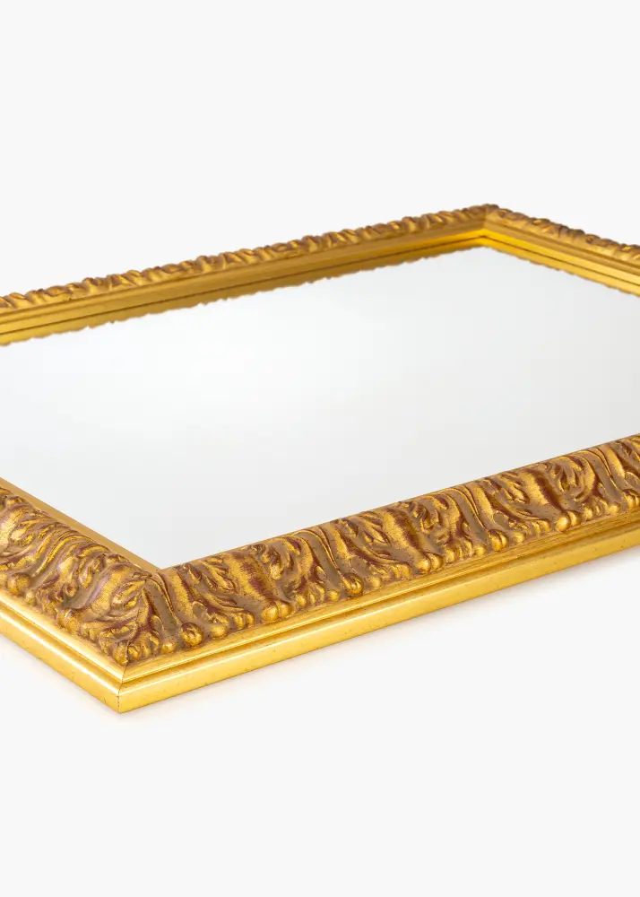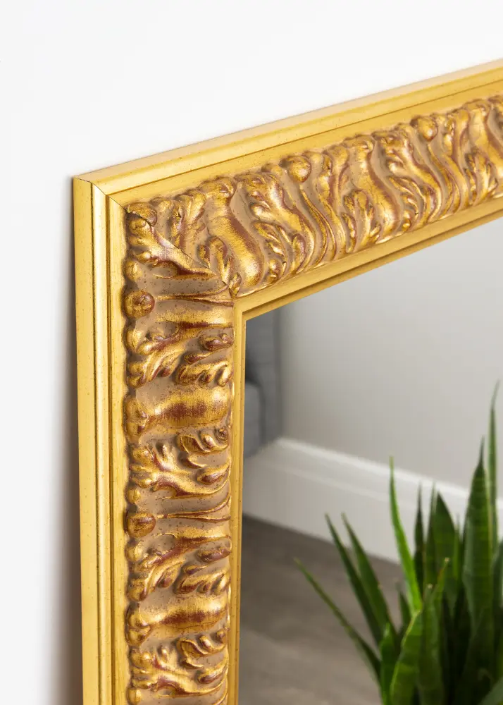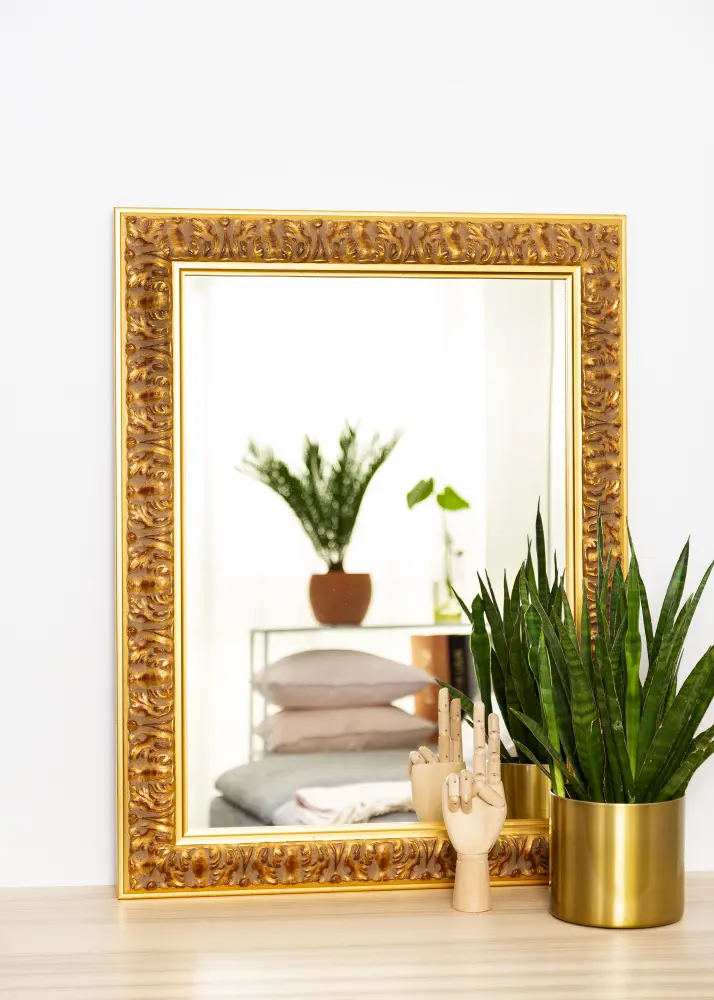 Apportez à votre intérieur une touche luxueuse avec des décorations qui évoquent le baroque. Ce miroir de haute qualité est orné d'un joli cadre à motifs baroques. Le cadre est fait de bois issu de la sylviculture durable et est peint dans différentes nuances d'or. Le long du verre court une étroite bordure dorée claire. Le miroir étant disponible en 7 tailles différentes, vous trouverez aussi bien un miroir pour votre coiffeuse qu'un miroir intégral.