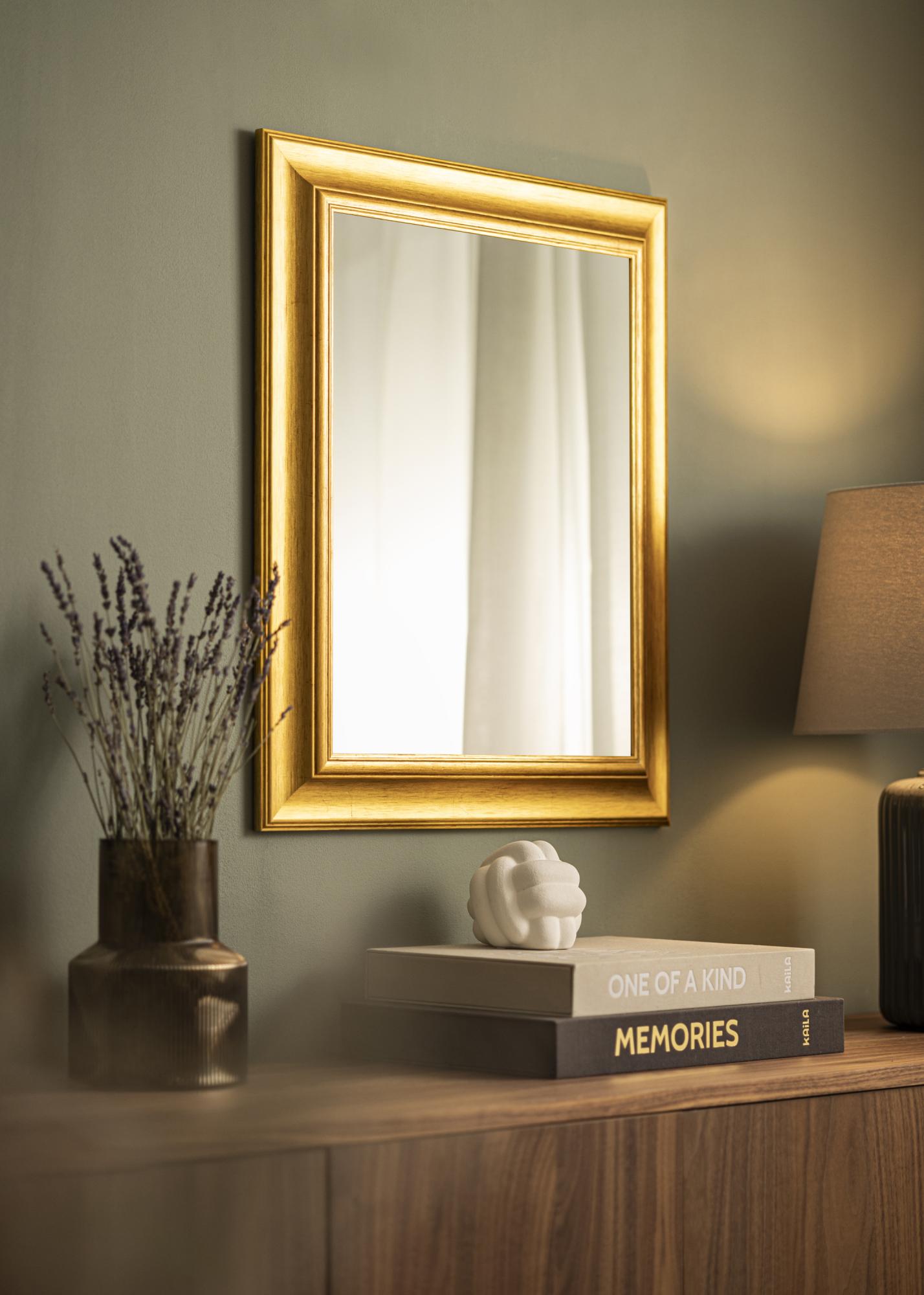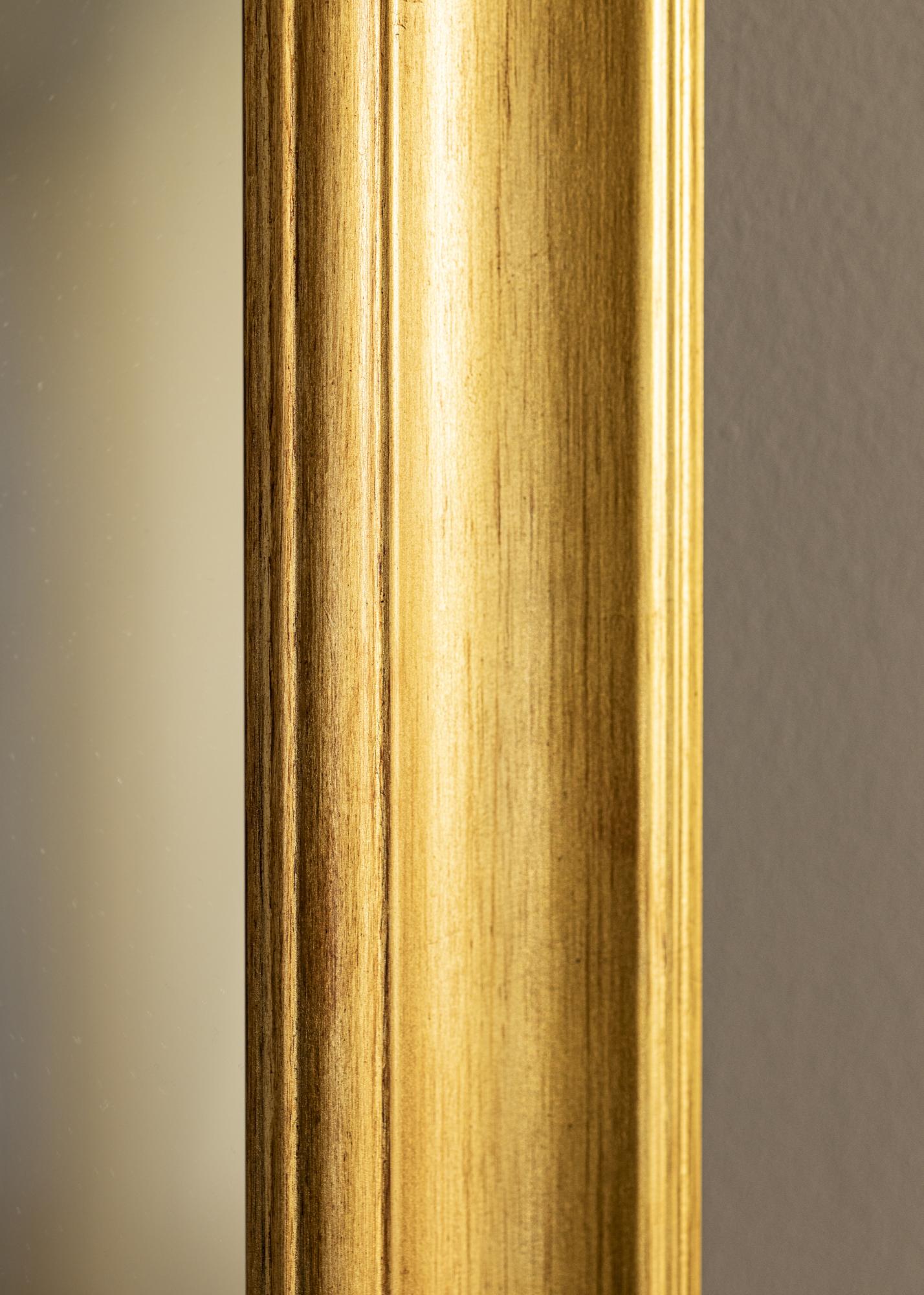 Le cadre est fabriqué en pin et présente une belle finition dorée antique. La surface brossée aux légères variations donne au miroir une sensation légèrement patinée, ce qui contribue à son caractère unique. Les lignes fines le long des bords créent une richesse de détails sophistiquée qui attire l'œil et renforce l'expression classique du miroir.