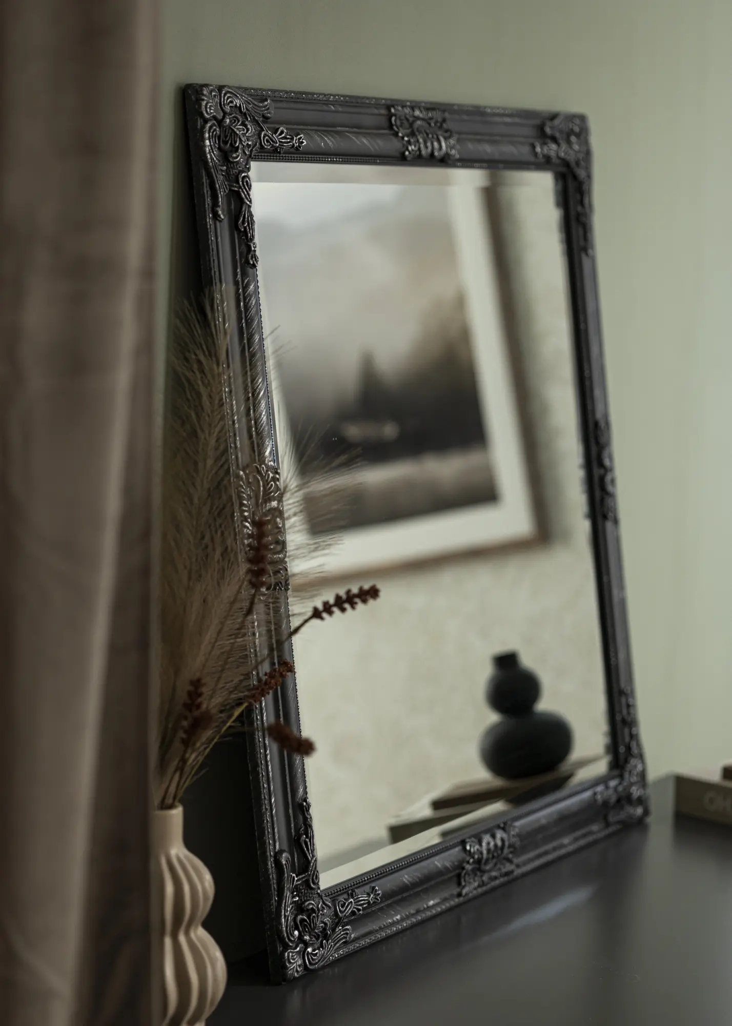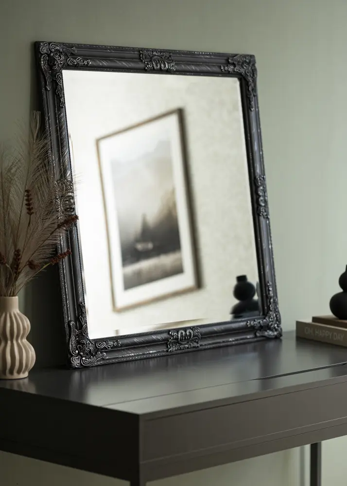 Ce miroir se démarque avec sa forme carrée qui crée une structure et un ordre dans la pièce, entouré d'un cadre sombre et détaillé qui apporte un style prononcé et raffiné. Le cadre noir est orné de détails fins qui rappellent l'esthétique opulente du baroque, ajoutant une touche luxueuse et dramatique à votre décoration intérieure.