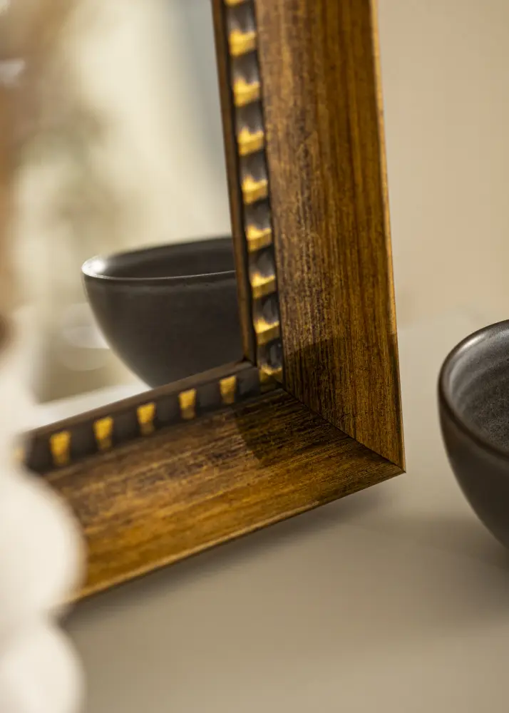 Ce miroir a une couleur brune chaude avec une finition antique élégante qui donne à la pièce un charme intemporel. Le profil large a une lueur subtile et est décoré avec un détail distinctif rayé en or et noir le long du bord intérieur. Cela crée un beau contraste et attire le regard vers le centre du miroir.