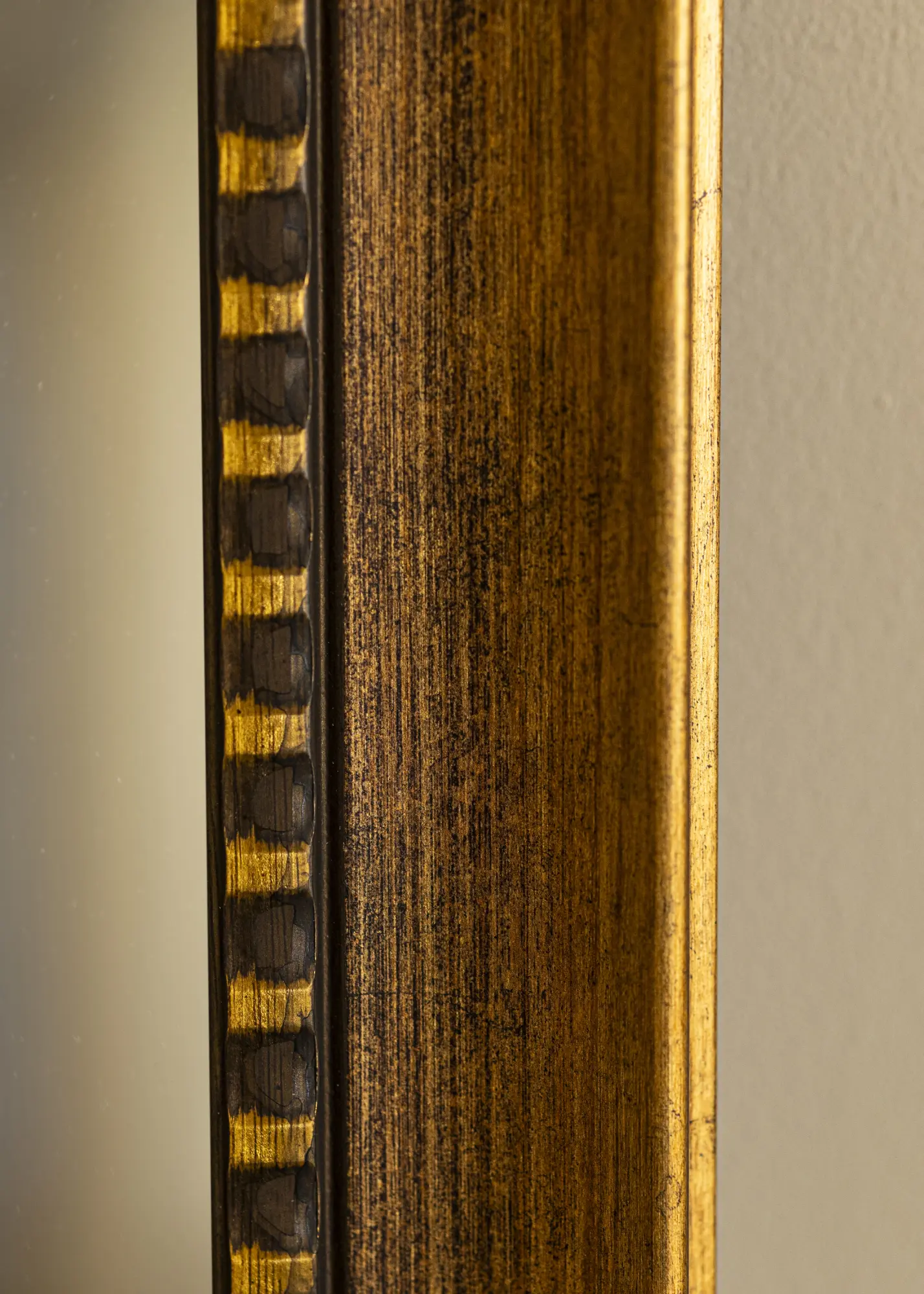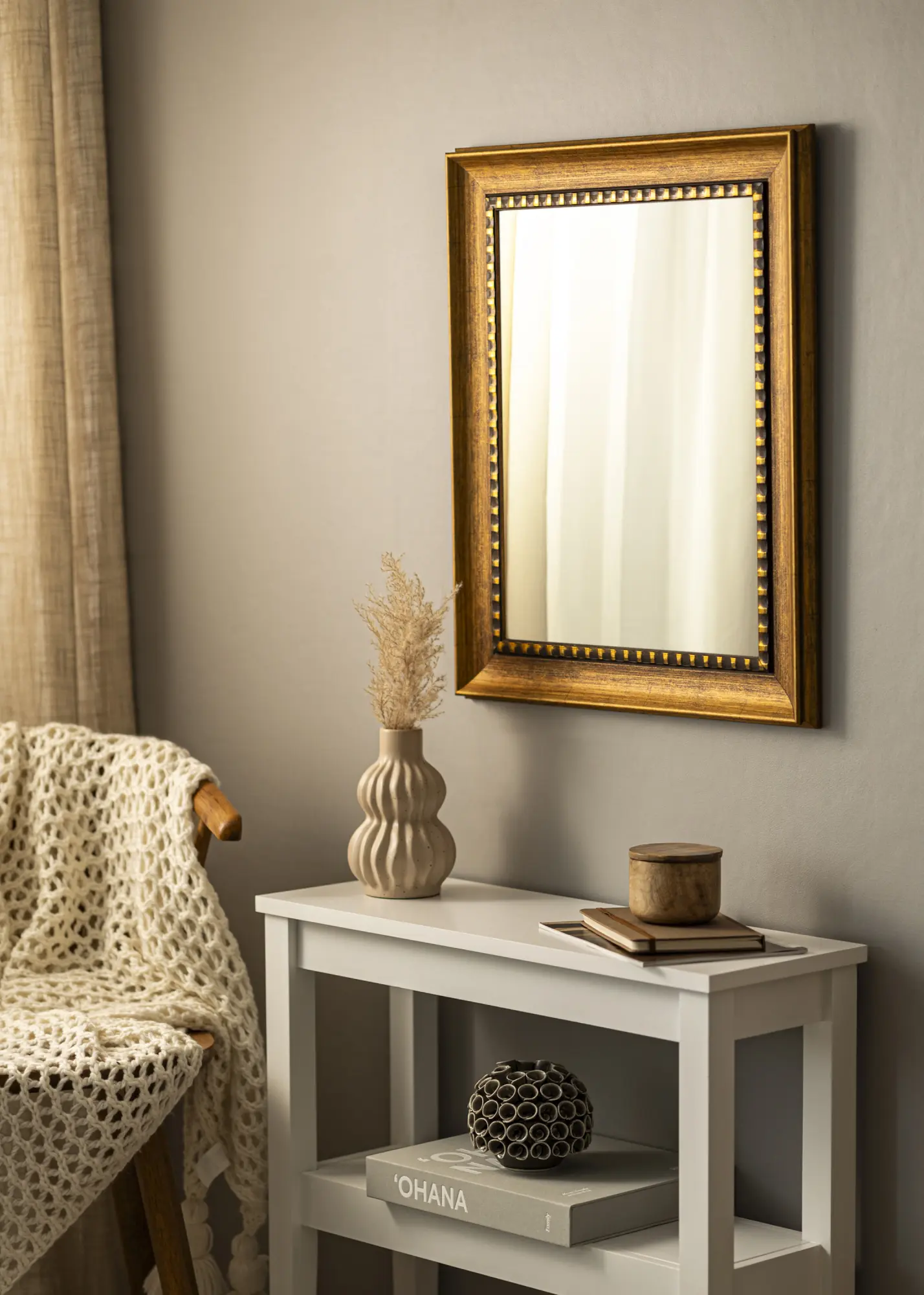 La structure du bois est visible dans le cadre, ce qui donne au miroir une sensation rustique qui s'adapte parfaitement aux intérieurs modernes et traditionnels. Le bord doré doux ajoute une touche sophistiquée, ce qui fait du miroir un élément élégant dans n'importe quelle pièce où il est placé.