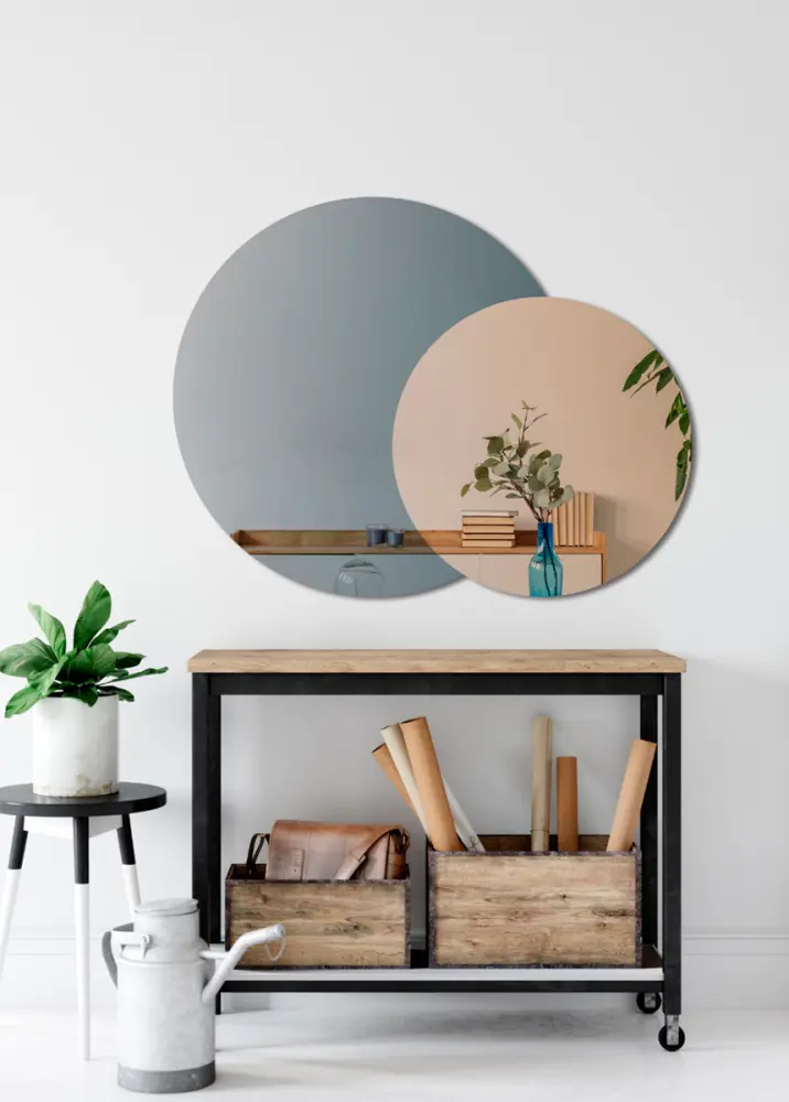 Voici un miroir vraiment attrayant et tendance provenant du danois Incado qui se compose de deux miroirs circulaires assemblés ensemble. La plus grande partie du miroir est incolore tandis que la plus petite est teintée en or rosé - un miroir vraiment superbe !