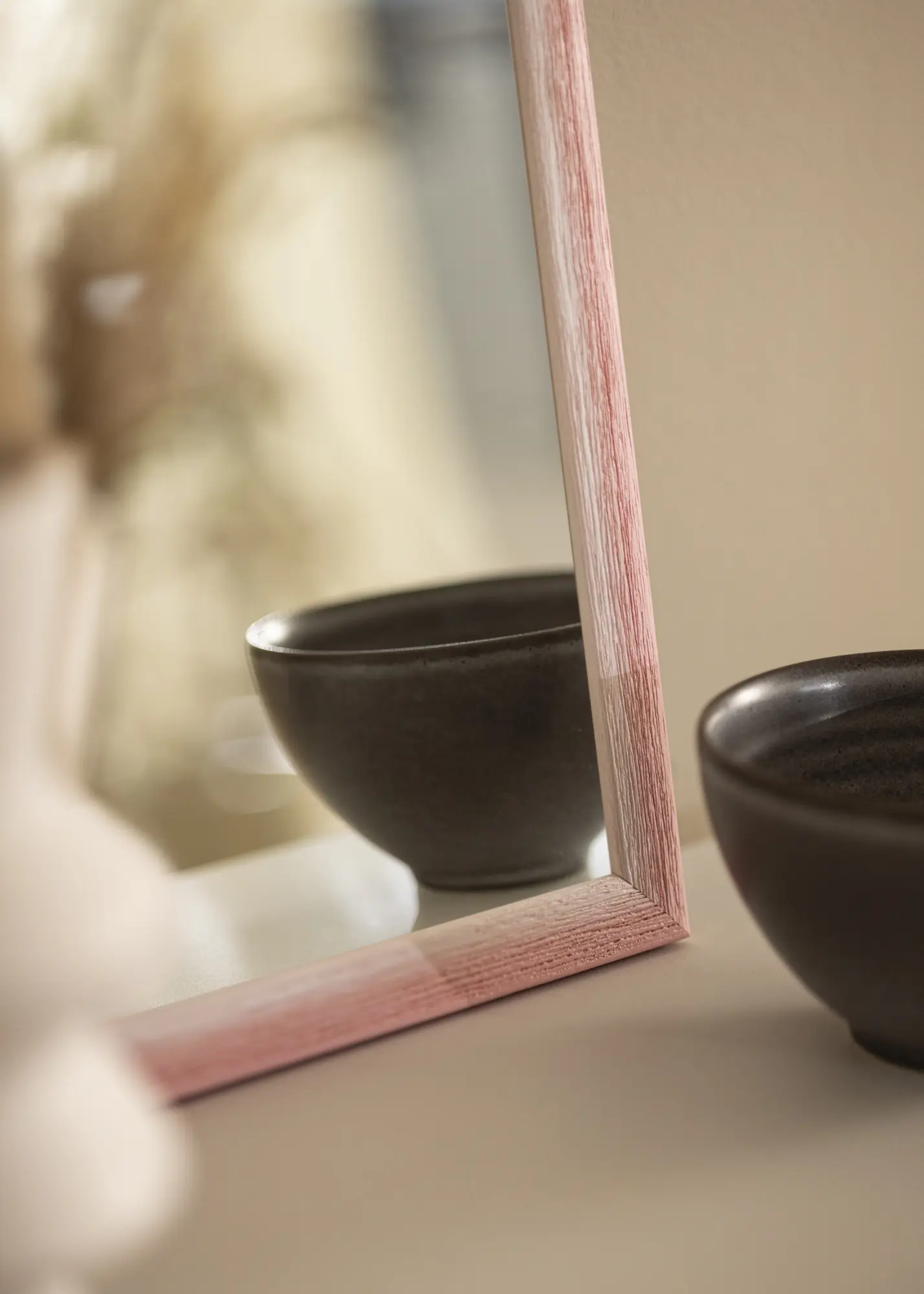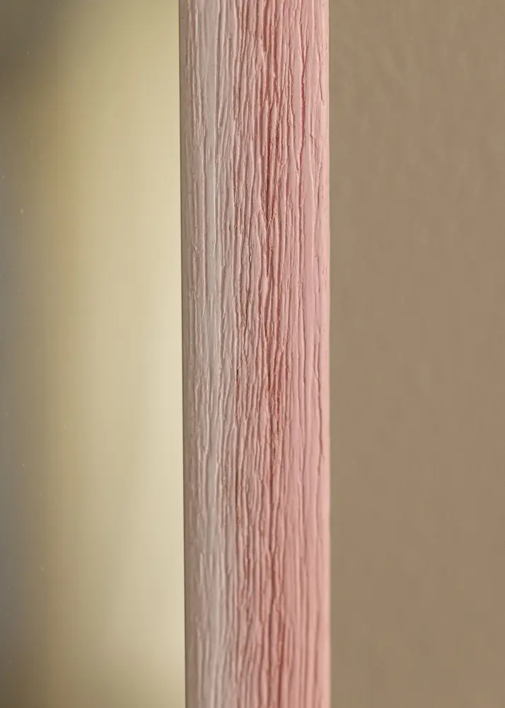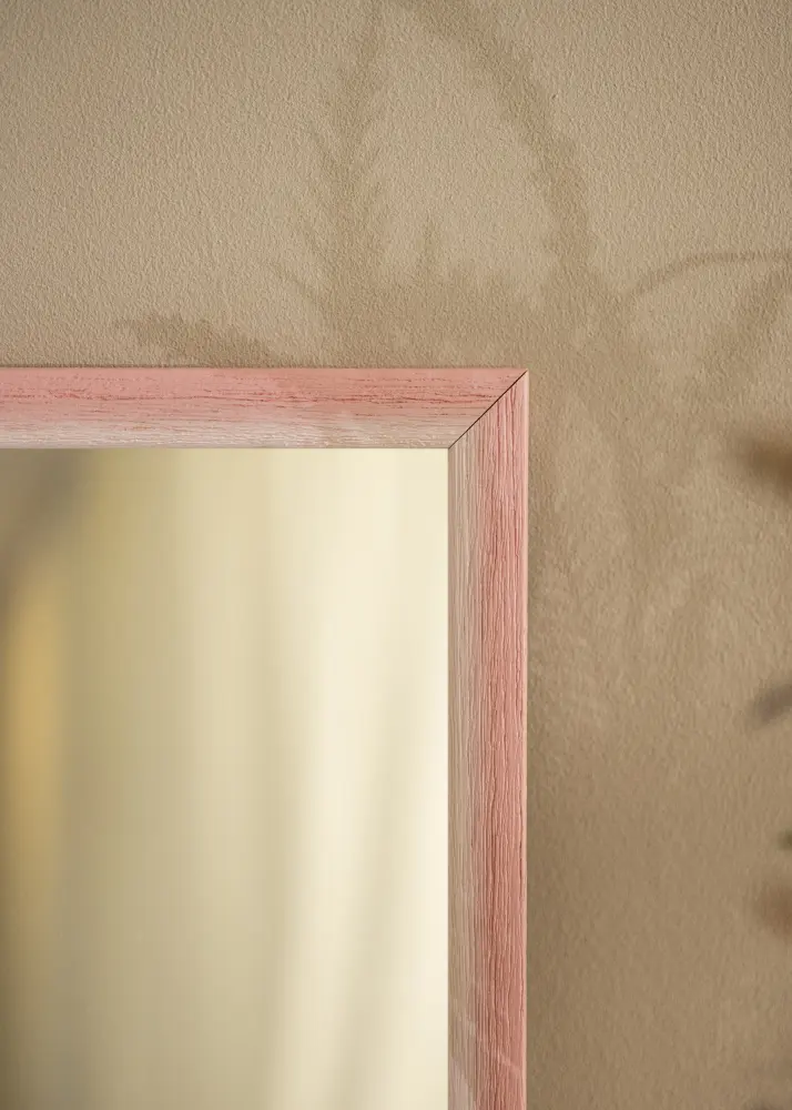 Le cadre du miroir Cornwall Rose mesure 23 mm de large et a une profondeur de 13 mm, ce qui lui donne une sensation solide et robuste. Fabriqué en bois d'ayo, le cadre met en valeur une texture de bois naturel avec des veines profondes qui confèrent au miroir un caractère rustique et terreux. L'effet peint à la main est créé par la transition douce des couleurs, donnant au cadre une expression vivante et dynamique.