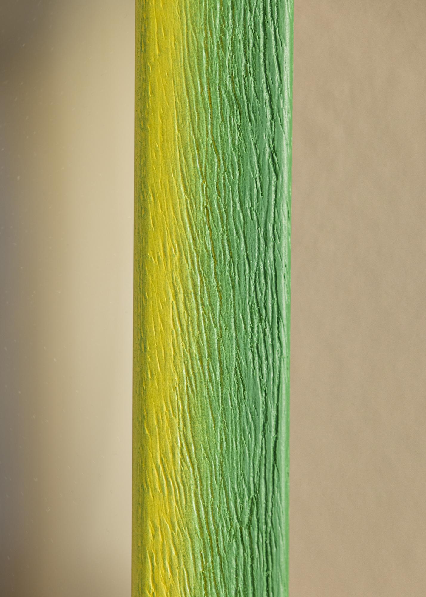 Ce miroir se distingue par sa palette de couleurs vibrante, où une douce transition du jaune solaire au vert luxuriant crée une atmosphère harmonieuse et accueillante. La surface est marquée par une structure de bois distincte avec des veines profondes, ce qui donne au miroir une sensation tactile à la fois moderne et rustique. Les tons de couleur se fondent naturellement pour créer un effet peint à la main avec une expression organique, rendant chaque miroir unique en son genre.