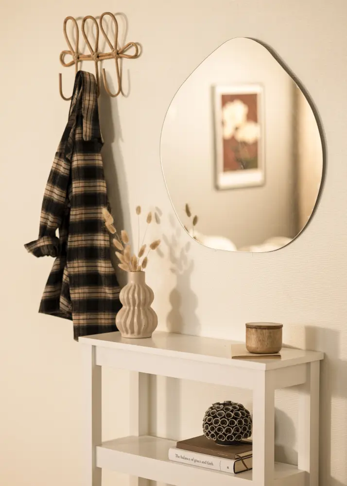 Ce miroir est conçu pour être polyvalent, avec la possibilité de l'accrocher à la fois en position verticale et horizontale. Cela vous donne la liberté de choisir comment il s'intègre le mieux dans votre espace, que ce soit dans l'entrée, la chambre ou le salon. Sa forme asymétrique apporte une touche moderne qui complète différents styles de décoration et crée un effet visuel intéressant.