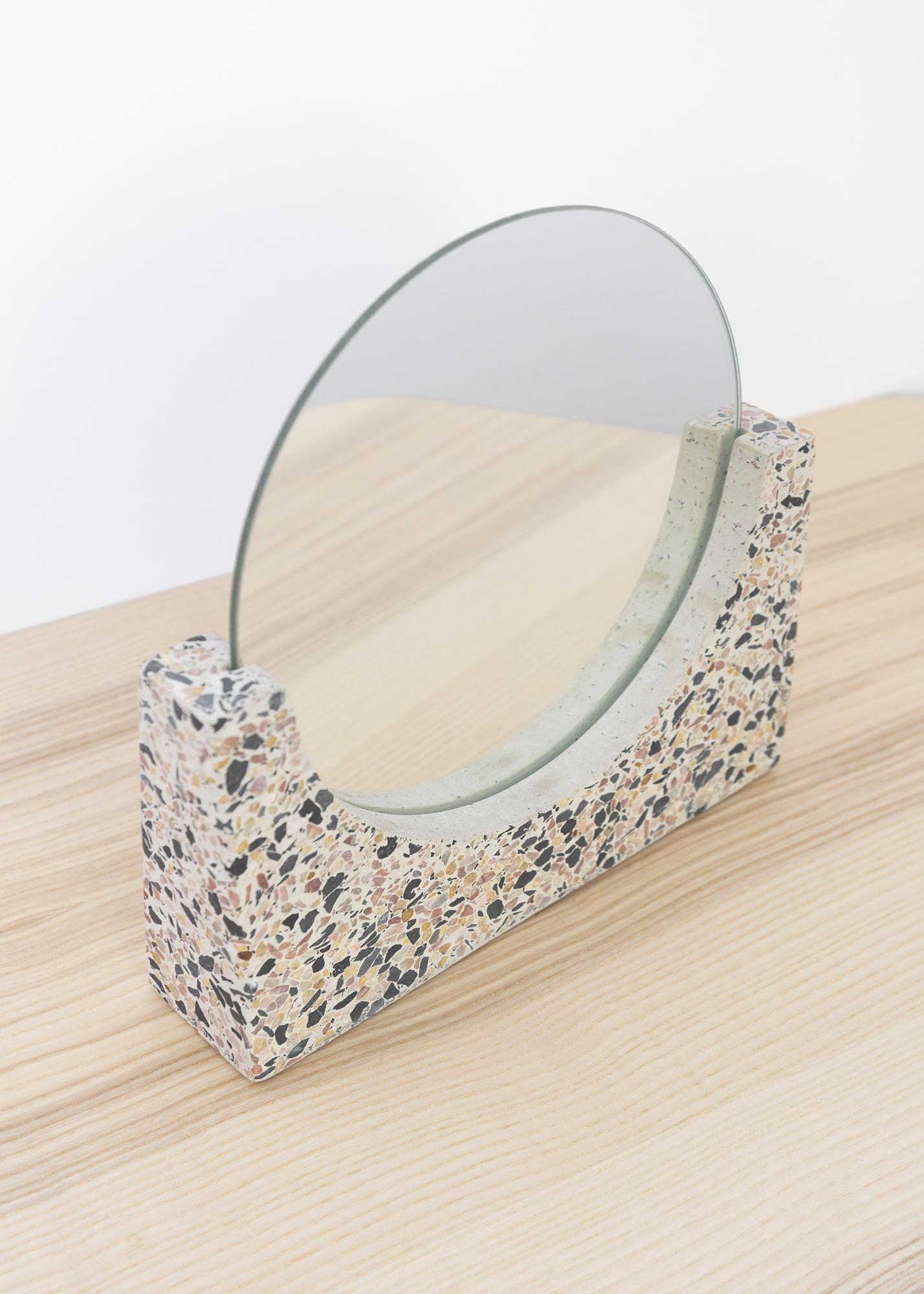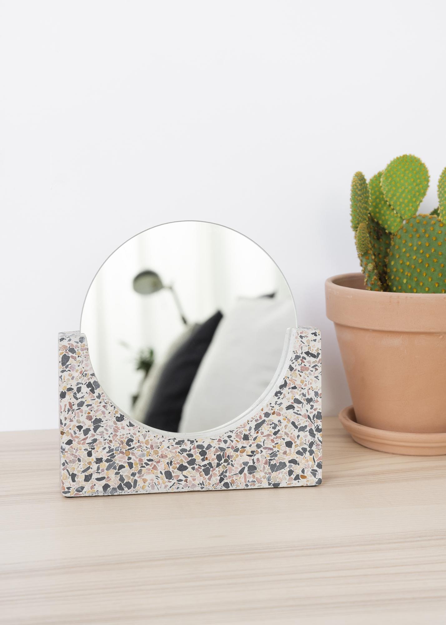 Ce miroir de table rond est pratiquement une œuvre d'art ! Un support élégant et robuste en beau terrazzo (pierre artificielle) blanc rend ce miroir bien plus que simplement fonctionnel. C'est un détail de décoration d’intérieur de bon goût, qui apporte un design moderne dans la pièce dans laquelle vous choisissez de le placer.