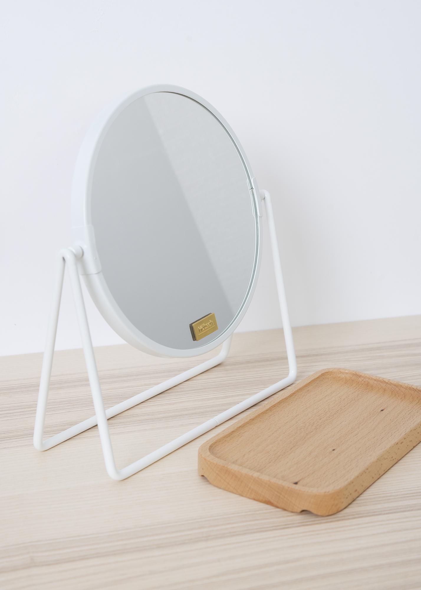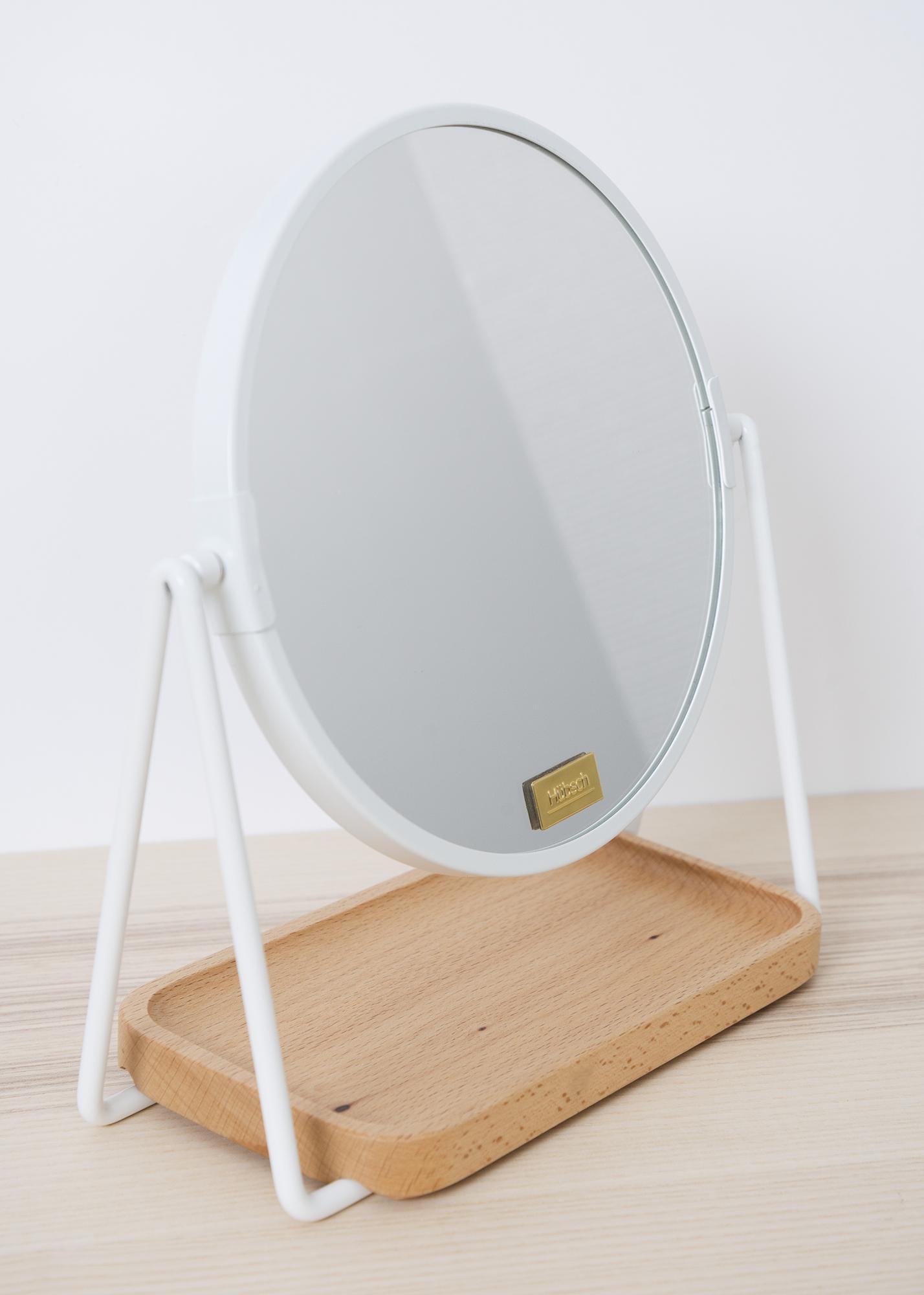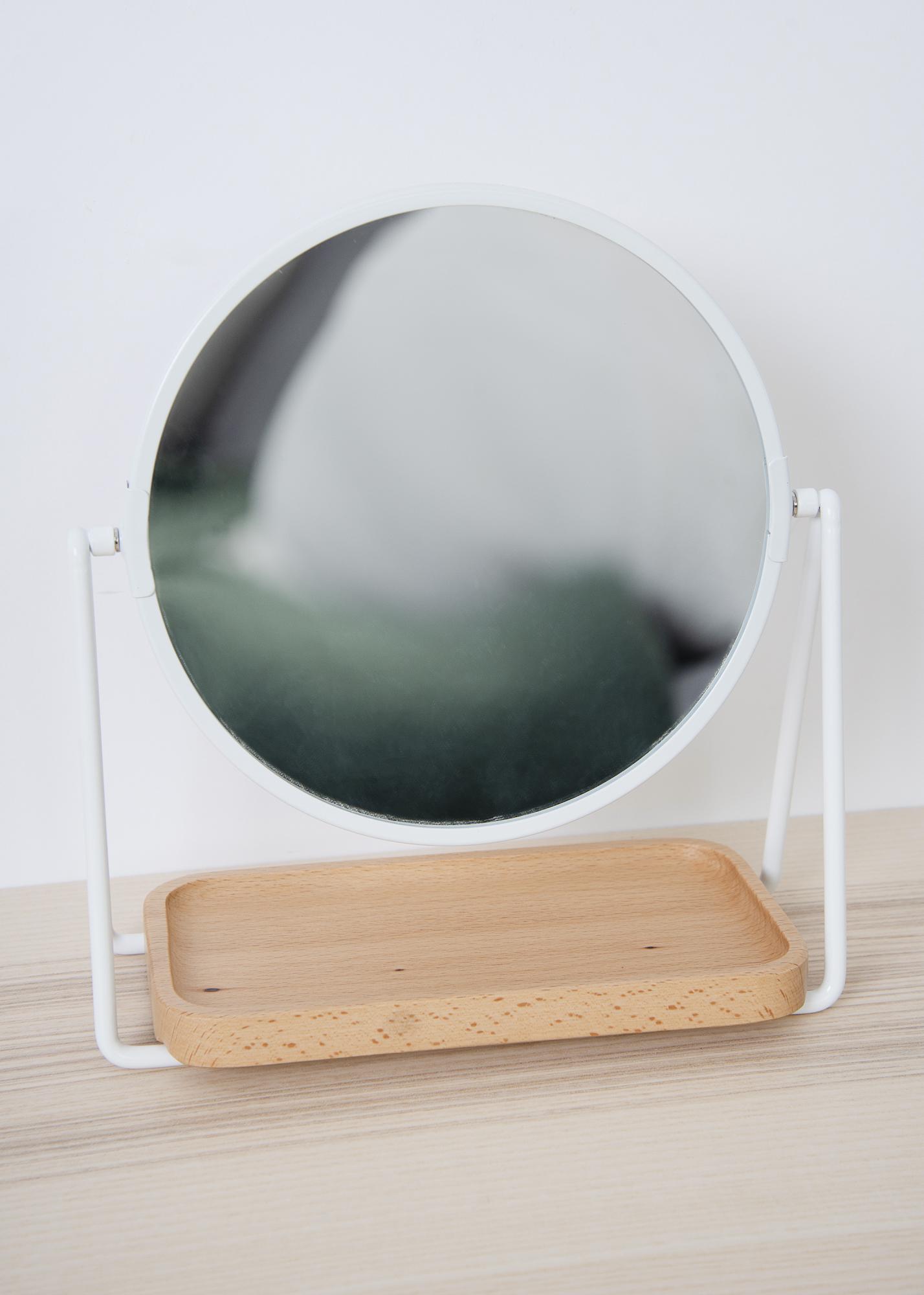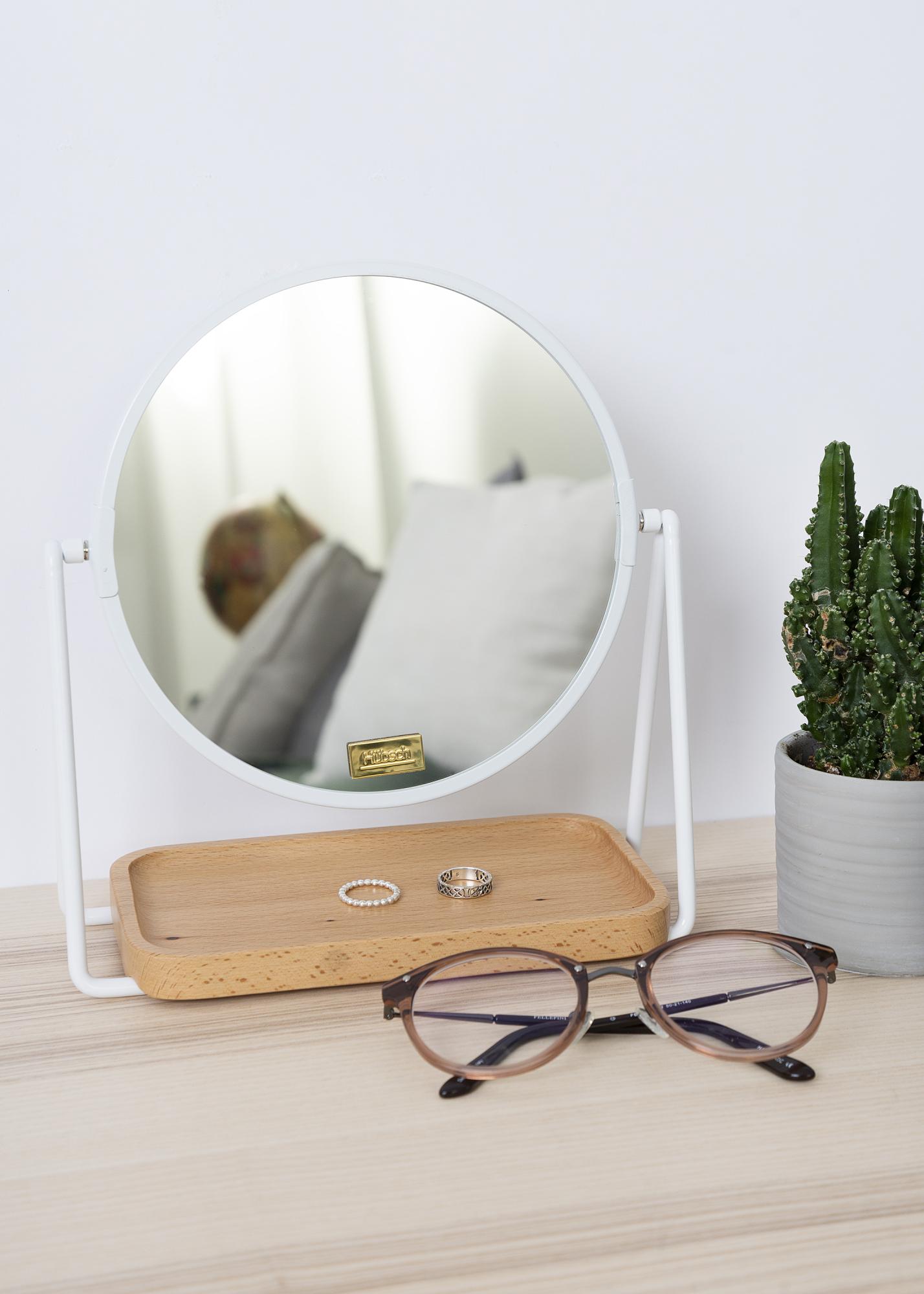 Ce miroir de table rond a un design à la fois décoratif et intelligent ! Le cadre élégant et le support en métal blanc font que ce miroir convient à tous les types d'intérieurs, classiques comme modernes. Le joli plateau en bois est parfait pour ranger ces petites choses que l’on a autrement tendance à perdre, tels que des bijoux ou des clés.
