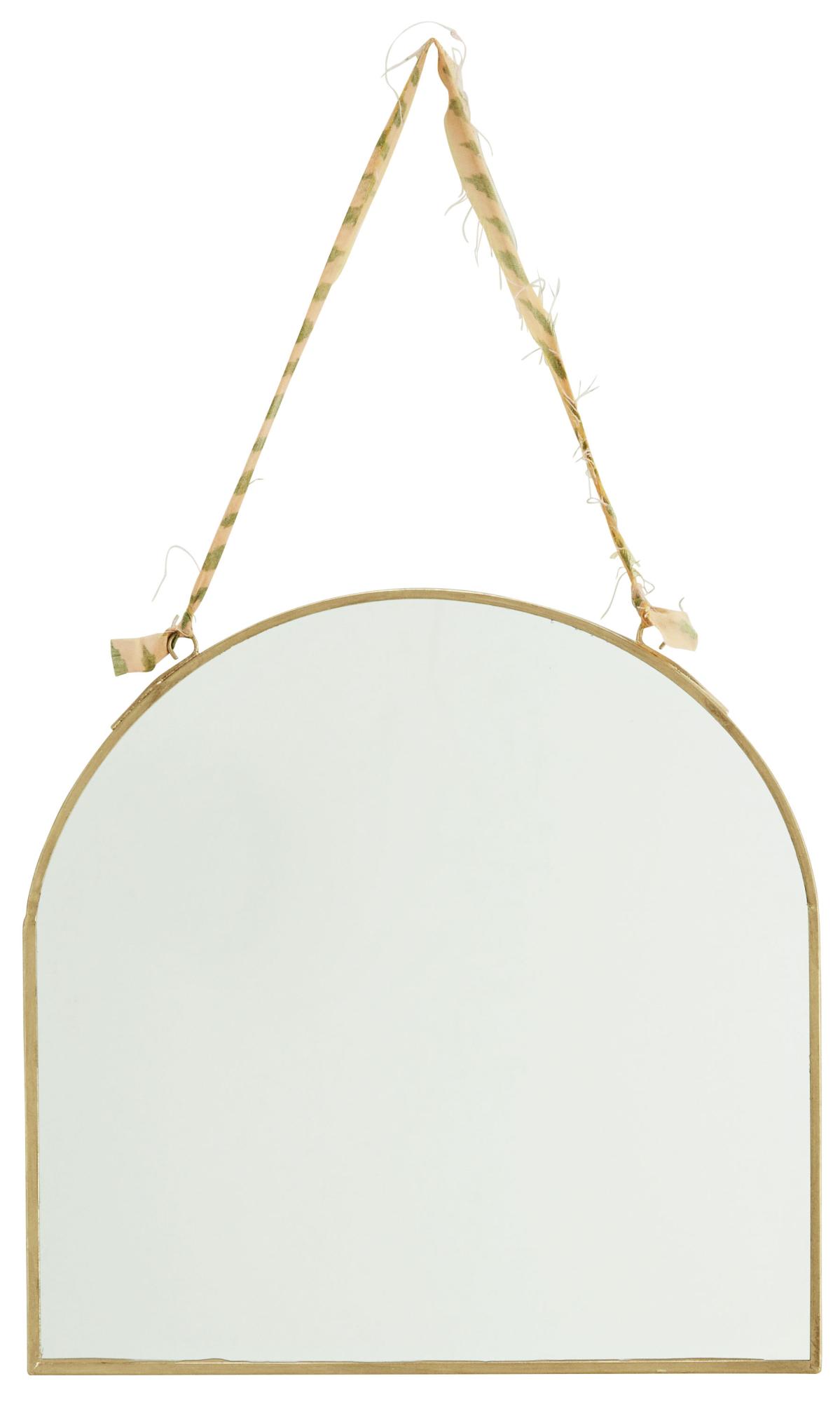 Miroir en forme d'arche de Madam Stoltz, avec cadre couleur laiton. Le miroir est accroché dans un ruban de coton, ce qui lui donne une expression bohème qui s'intègre parfaitement dans le salon et la chambre. Le miroir mural mesure 23x23 cm. La taille délicate du miroir mural le rend très intéressant à assortir avec d'autres modèles de miroirs.
