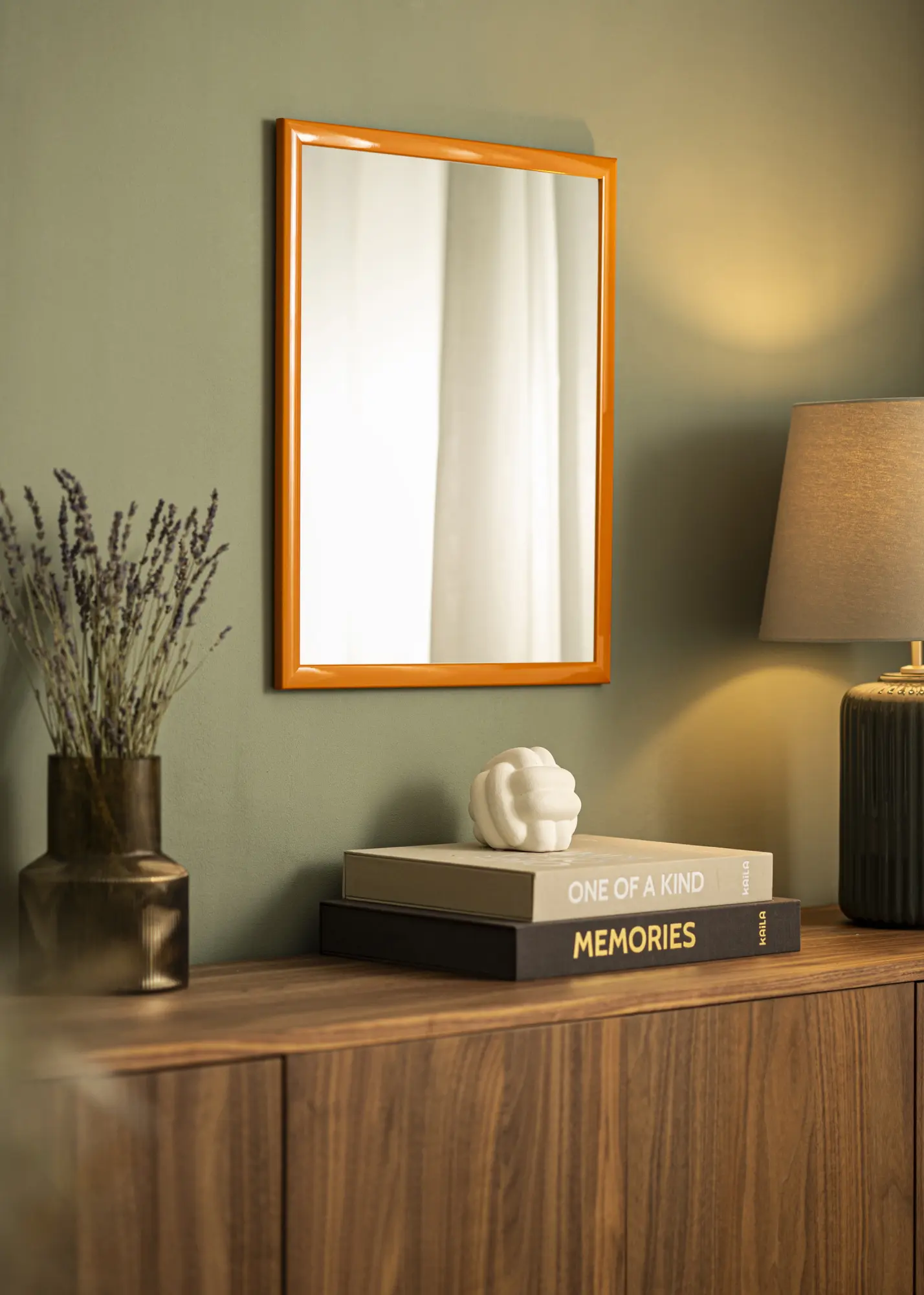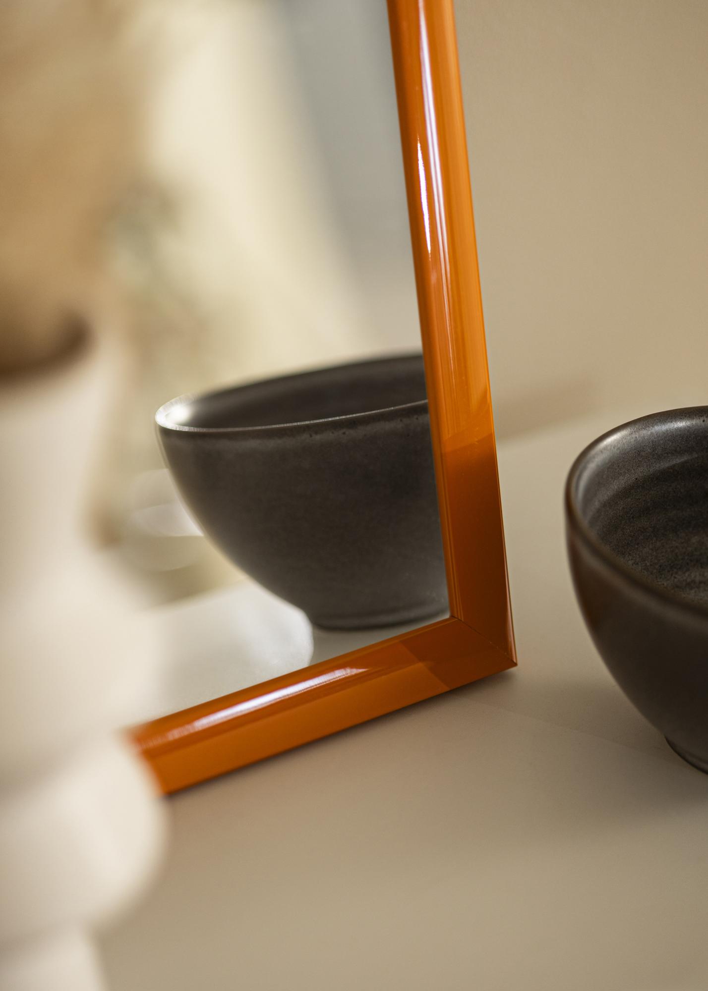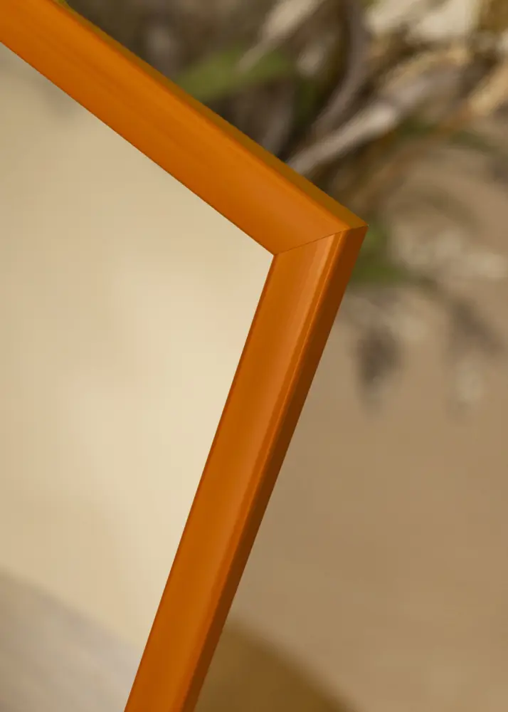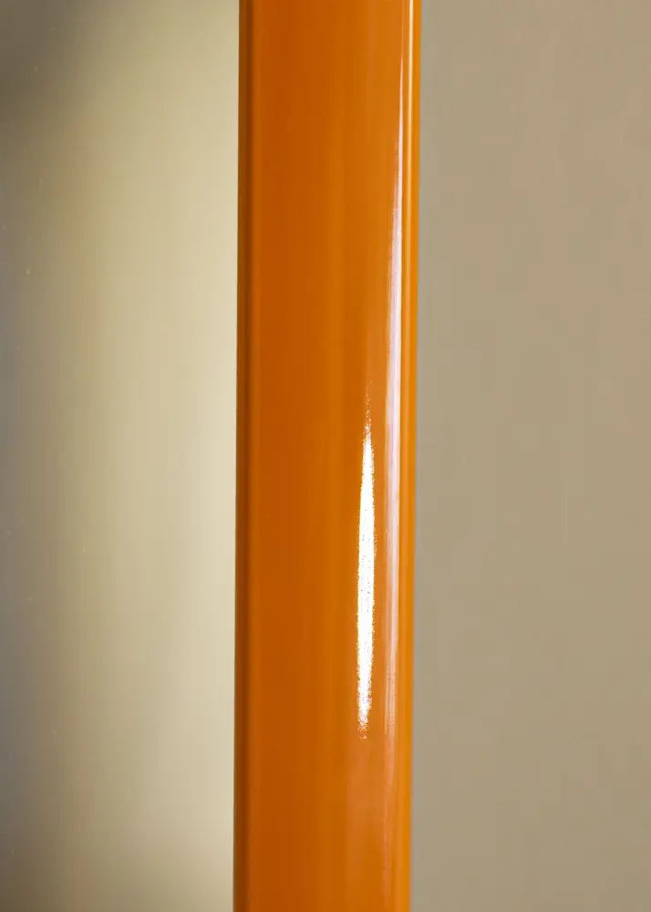 Le cadre du miroir mesure 23 mm de large et a une profondeur de 13 mm, ce qui donne une sensation stable et robuste sans dominer la pièce. Fabriqué en bois d'Ayos, ce miroir offre à la fois durabilité et style. Le cadre étroit apporte une touche moderne tout en laissant la couleur orange vive au centre de l'attention.