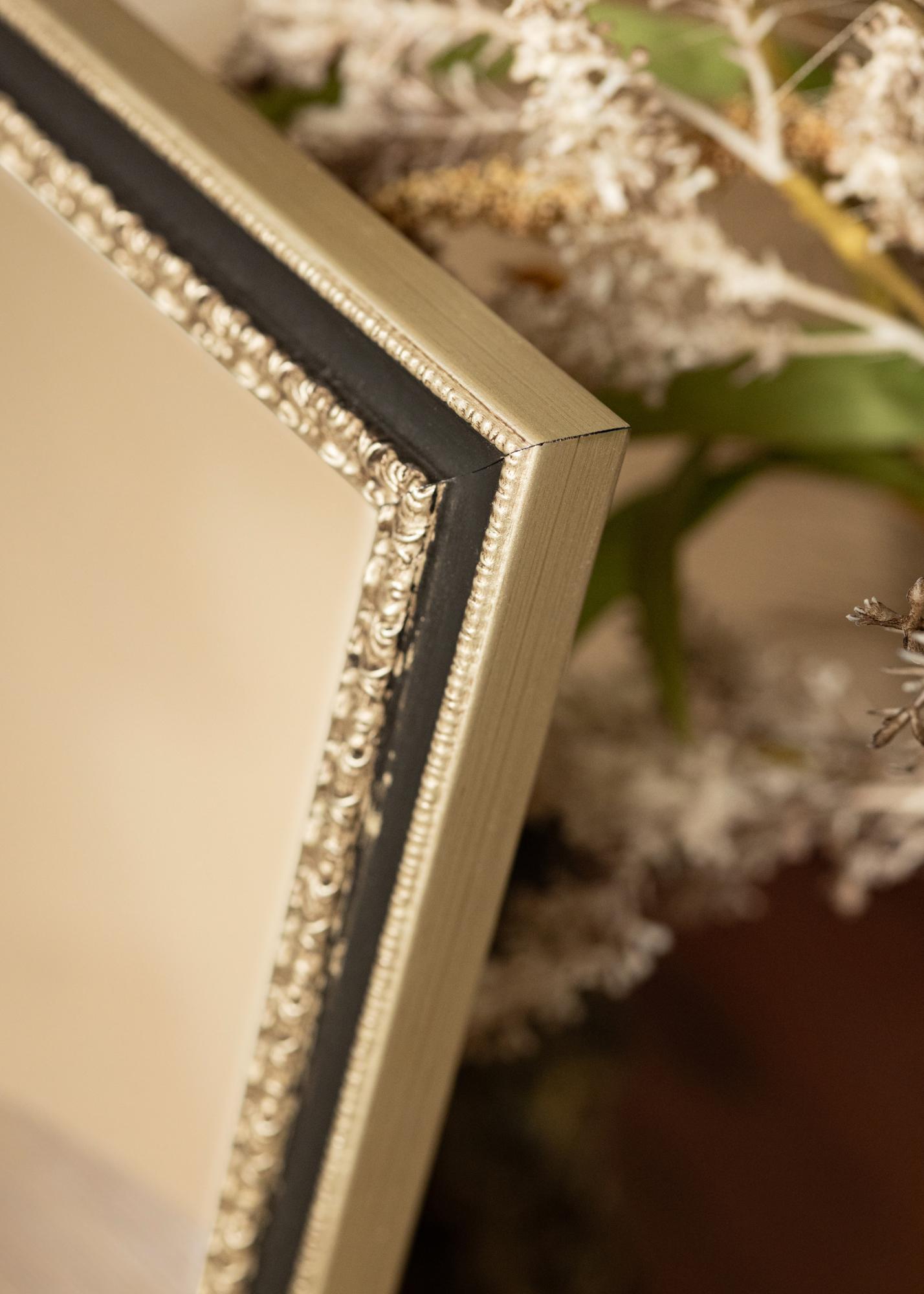 Le cadre est fabriqué en bois et possède une finition or antique avec des ornements décoratifs qui donnent au miroir un aspect classique et intemporel. Les détails ornés sont encore accentués par le bord noir, créant un équilibre harmonieux entre l'ancien et le moderne.