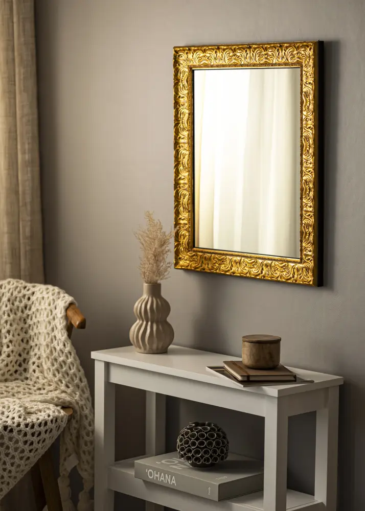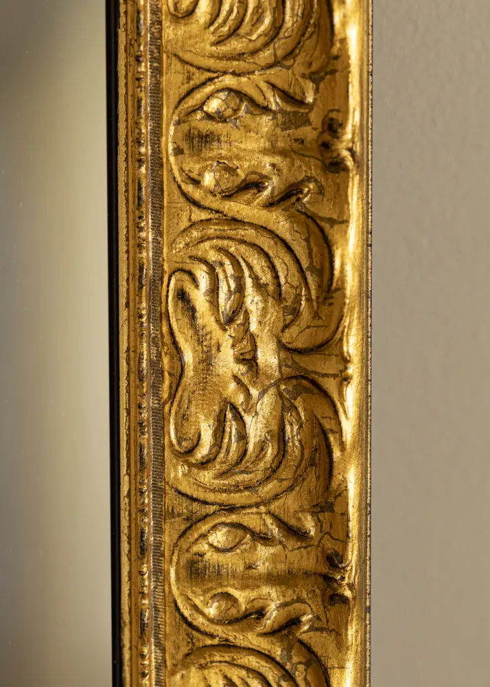Les détails en relief profonds sur le cadre contribuent à l'apparence luxueuse du miroir et créent une sensation d'exclusivité. Que vous le placiez dans le hall d'entrée, le salon ou la chambre, le Miroir Durham Or apportera une touche sophistiquée à la pièce.