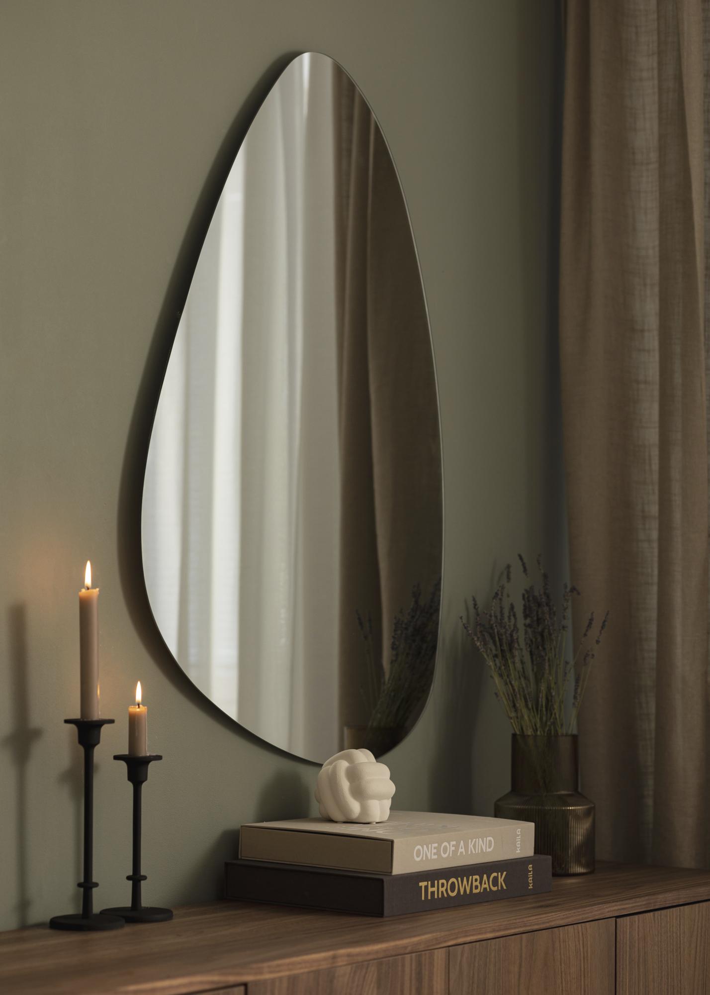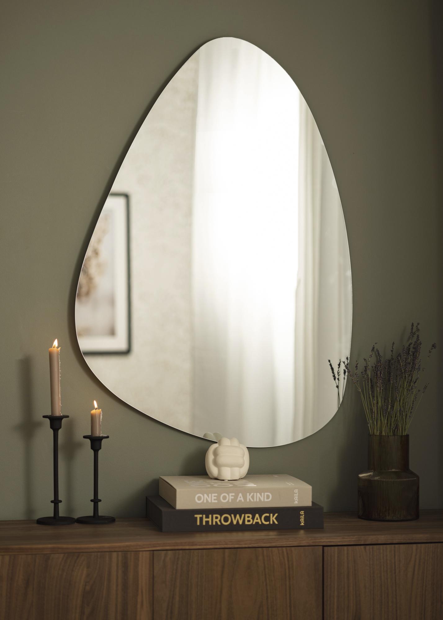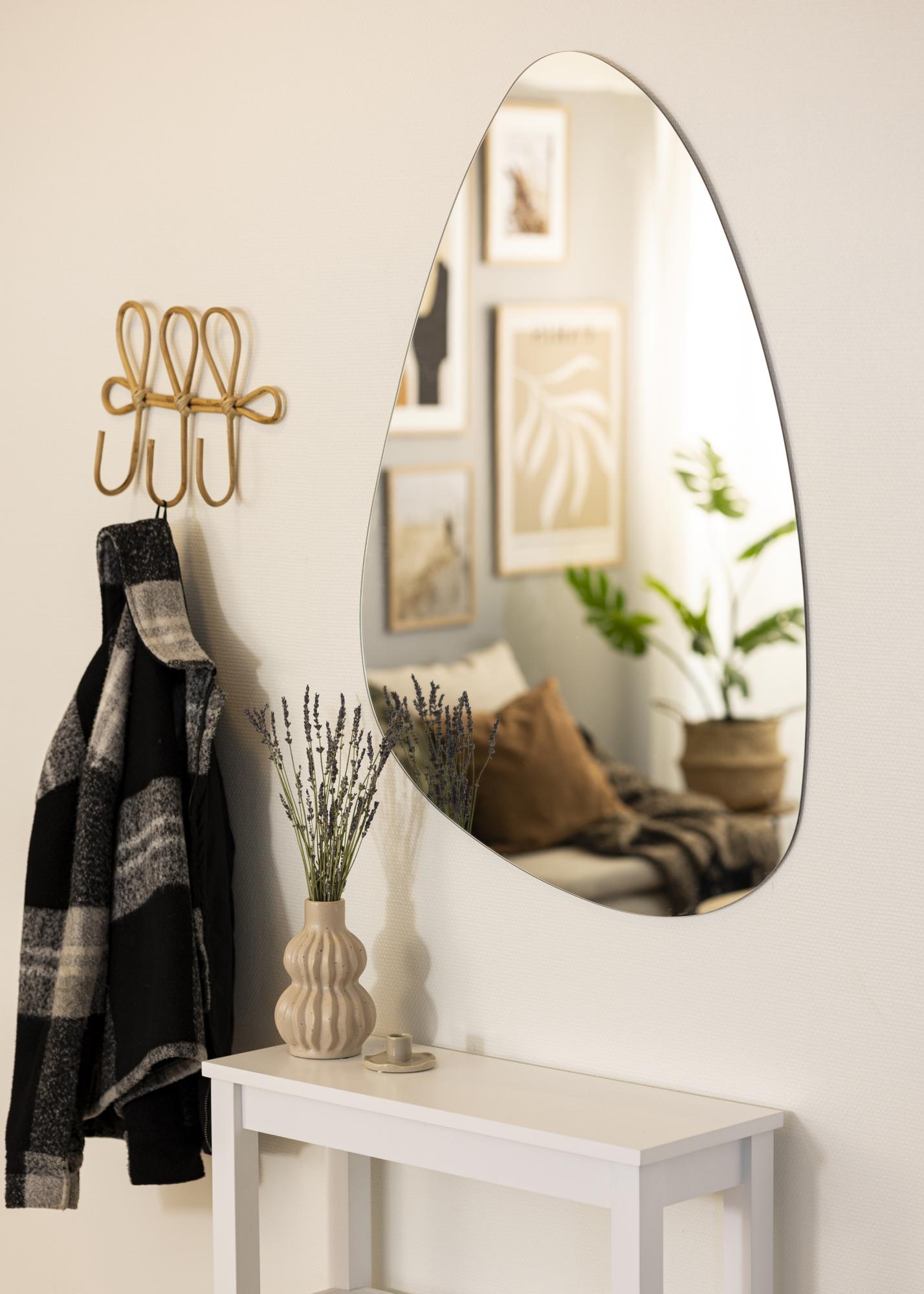 Ce miroir est parfait pour ceux qui sont à la recherche d'un miroir élégant dans un style minimaliste. Sa forme assymétrique se dote d'un verre réfléchissant mince et des bords sans cadre, ce qui offre un ensemble très élégant. À l'arrière se trouvent des supports muraux.
