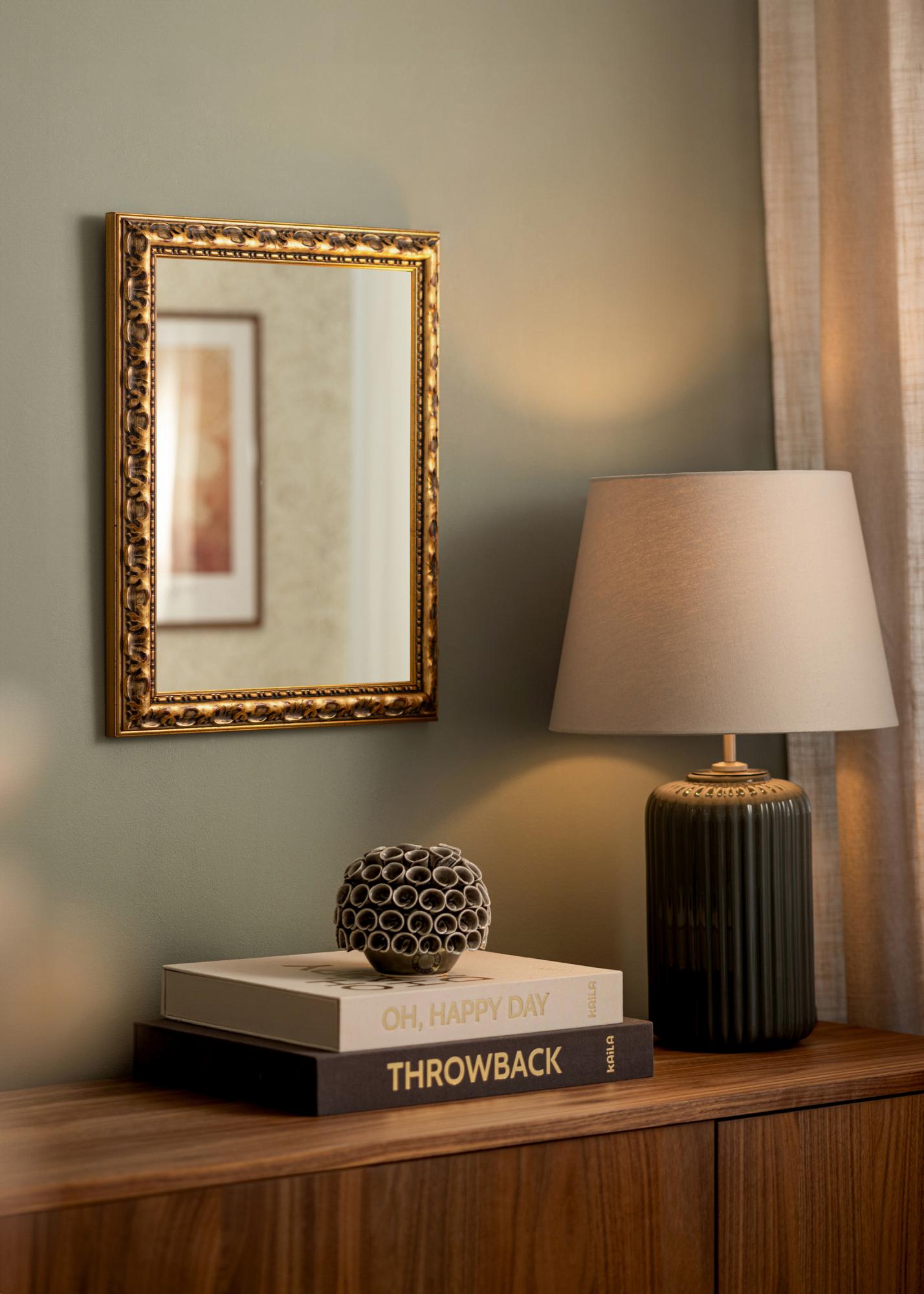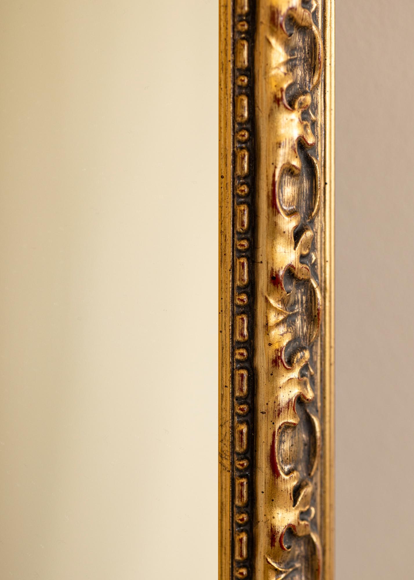 Le cadre du Miroir Freyja Or a une largeur de 38 mm et une profondeur de 34 mm, ce qui donne au miroir une sensation robuste et solide. Fabriqué en pin, il combine durabilité et esthétique classique. La finition antique avec des détails patinés sombres et des touches subtiles de rouge renforce le caractère rustique du miroir et lui donne un charme intemporel.