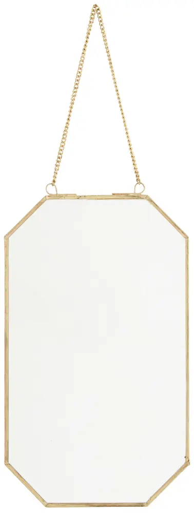 Miroir octogonal de Madam Stoltz, avec un raffiné cadre en laiton. Le miroir est suspendu avec une chaîne, également en laiton, ce qui lui donne une expression élégante qui convient parfaitement au salon et à la chambre. Le miroir mural mesure 15x25 cm. La taille délicate du miroir mural le rend très intéressant à assortir avec d'autres modèles de miroirs.