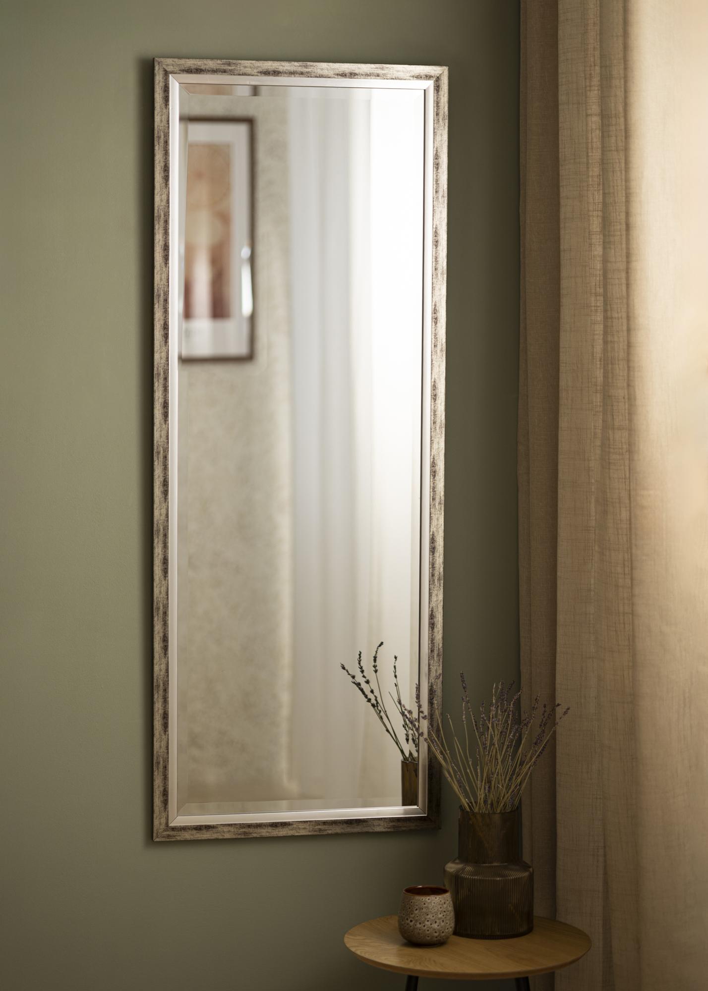 Rendez le mur attractif avec ce joli miroir ! Le miroir a un cadre argenté avec une large partie "usée" à l'extrémité et une partie blanche au plus proche du verre. Le verre est joliment incliné et l'ensemble crée de la profondeur sur votre mur. Le design s'intègre aussi bien dans une maison rurale et moderne comme dans une maison plus urbaine. Choisissez entre les tailles 40x80 cm, 60x80 cm et 50x130 cm.