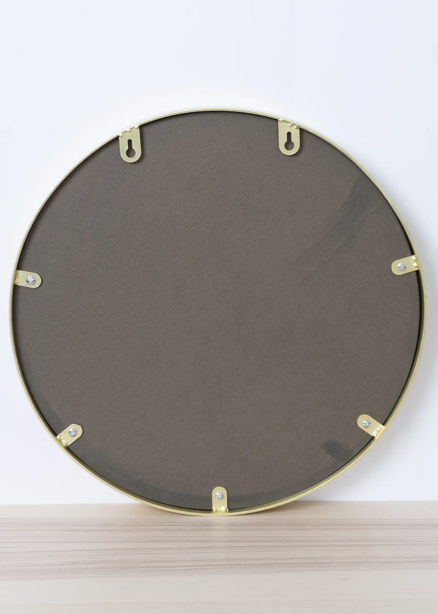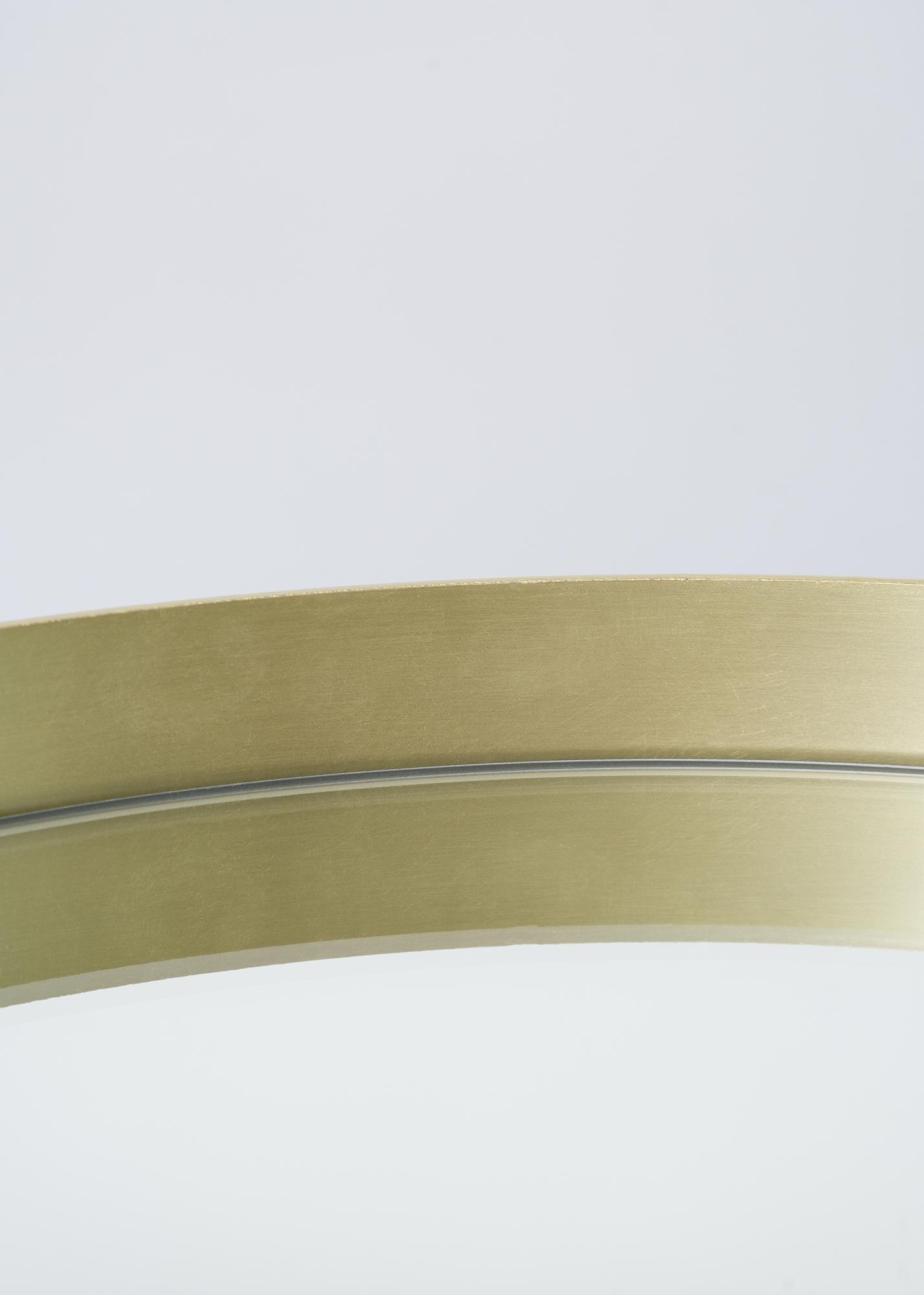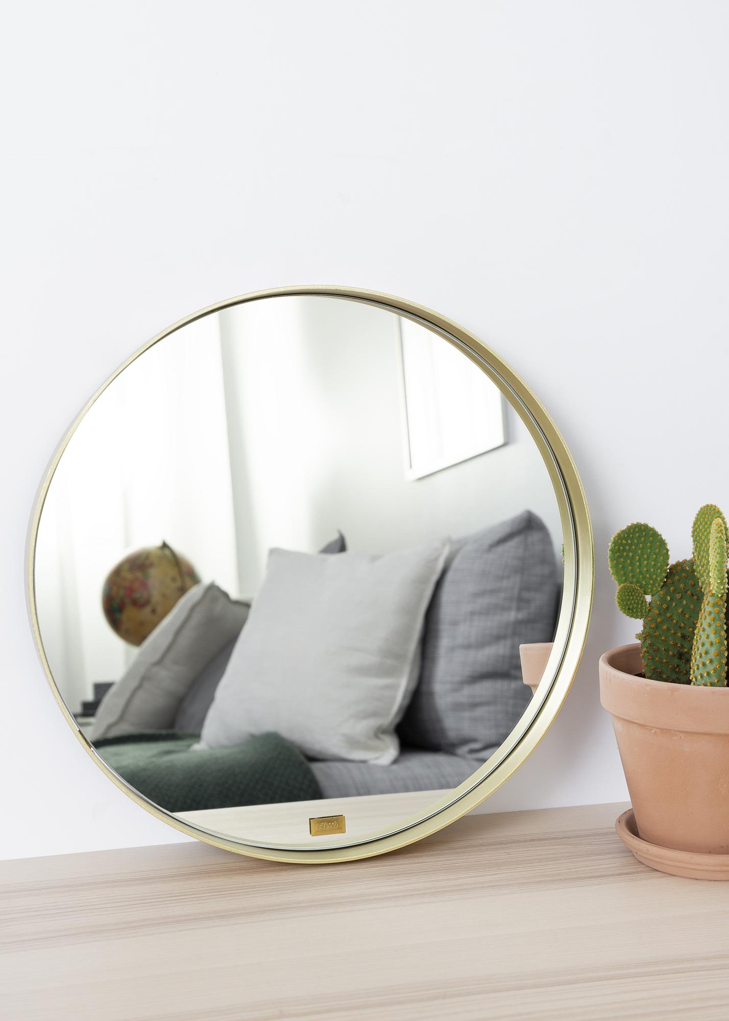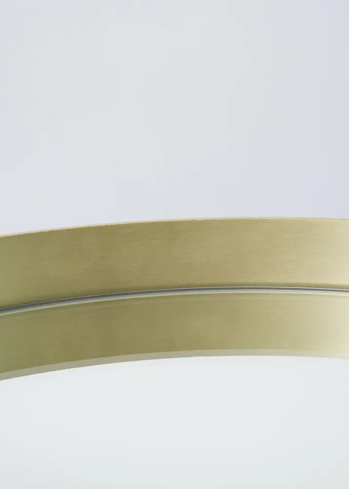 Un miroir mural rond avec une ambiance accueillante et exclusive. Le miroir est entouré d'un cadre en métal couleur laiton. Une monture fine et épurée, alors que son bord est haussé de quelques centimètres pour donner un effet chic à l'ensemble.