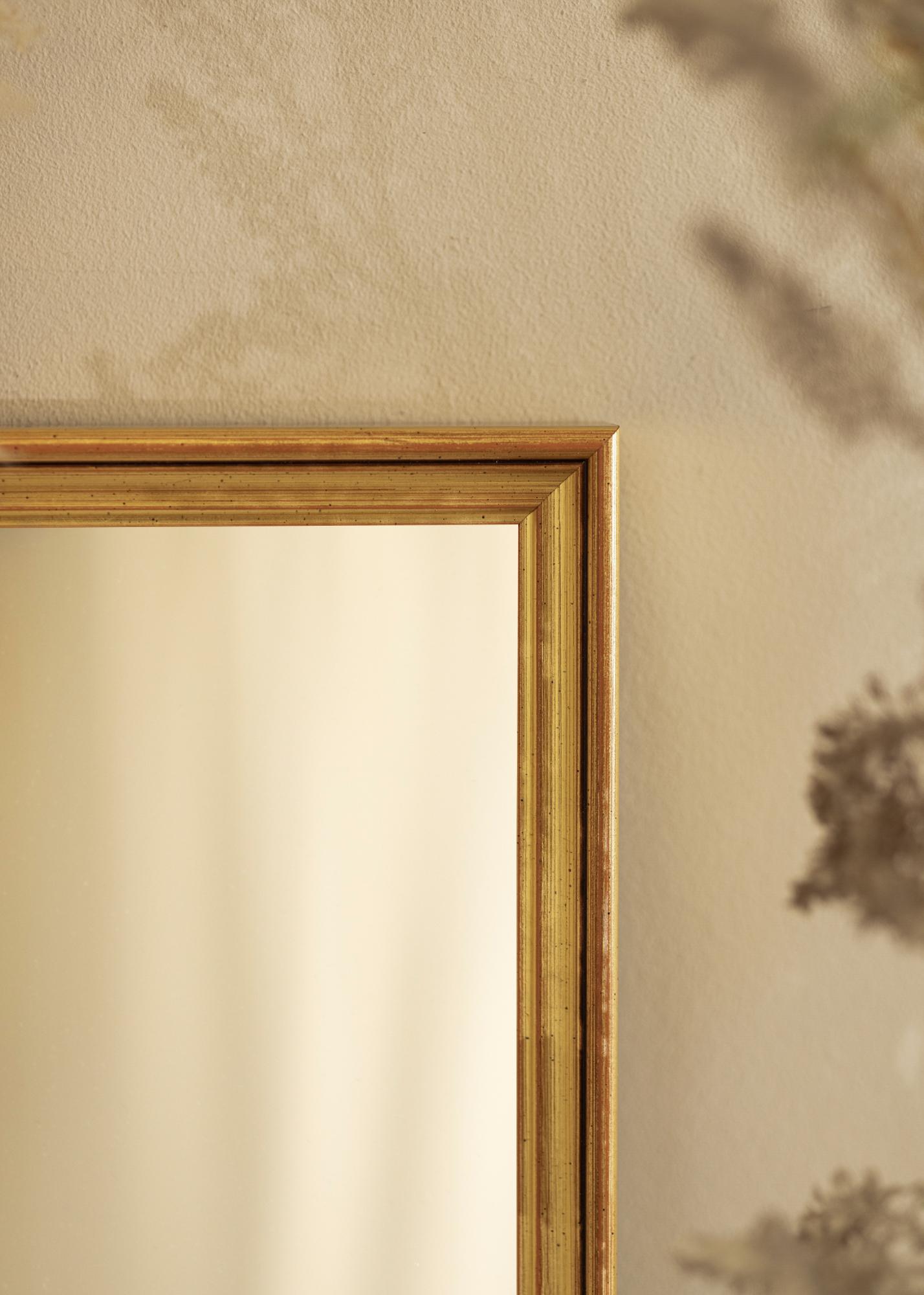 Ce miroir a une profondeur de 39 mm, ce qui lui confère une sensation robuste sans être trop lourd ou dominant. Fabriqué en pin, il combine durabilité et légèreté, ce qui le rend facile à monter sur le mur. La surface dorée a une finition légèrement antique avec de petits détails sombres, créant un caractère intemporel qui convient aux styles d'intérieur modernes et classiques.