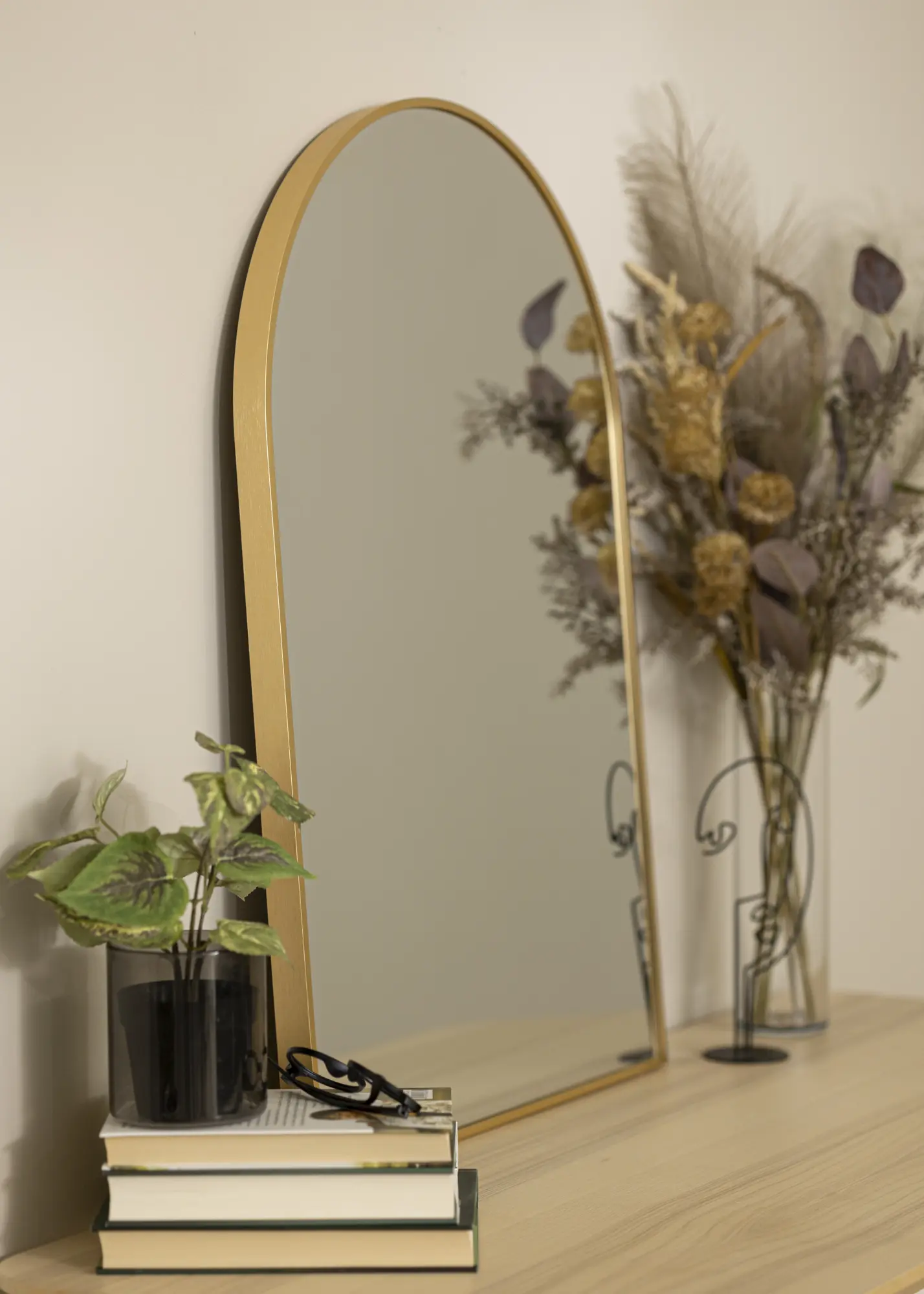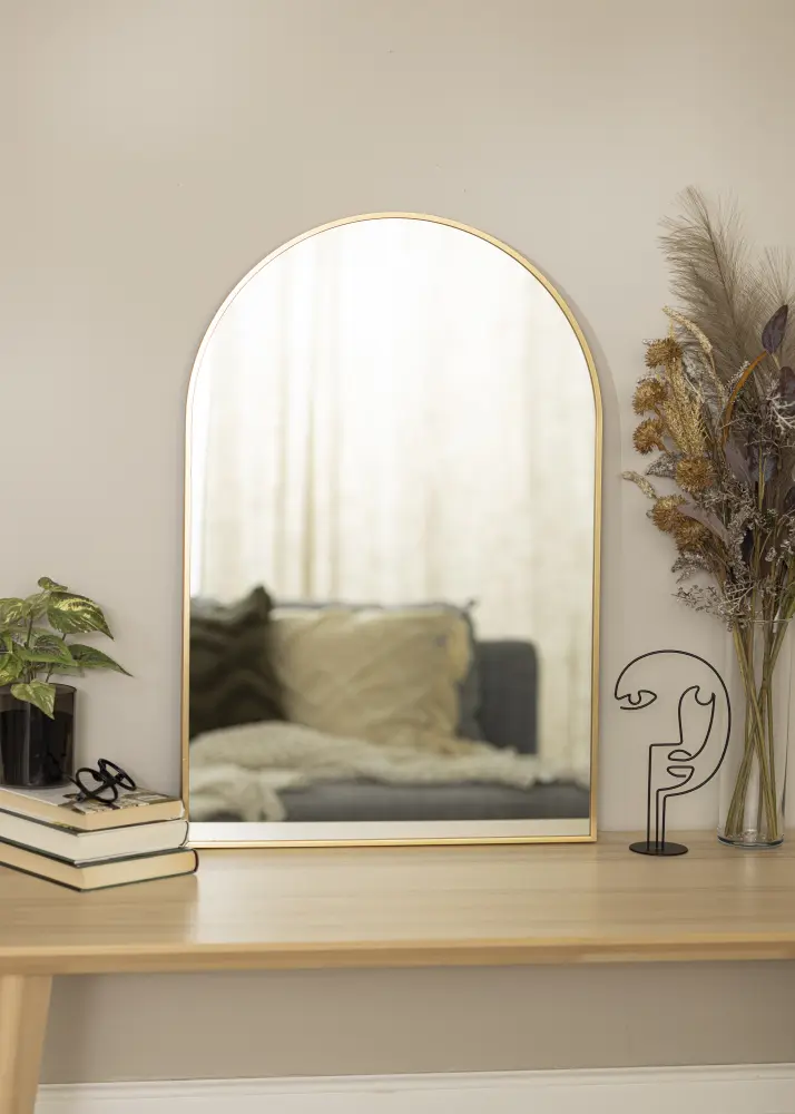 Voici un miroir mural moderne qui peut s'utiliser dans toutes les pièces de la maison. Vous pouvez en faire un détail d'intérieur tendance dans la chambre à coucher ou bien dans le salon, ou pourquoi pas l'utiliser comme miroir de salle de bain ou bien comme miroir dans le hall d'entrée afin de vous jeter un dernier coup d'œil avant de partir pour la journée. Le miroir se pare d'un encadrement en métal d'une profondeur de 28 mm, il se présente dans une teinte dorée exclusive pour plus de finesse. Son design stylisé sous forme d'arche renforce son aspect luxueux.