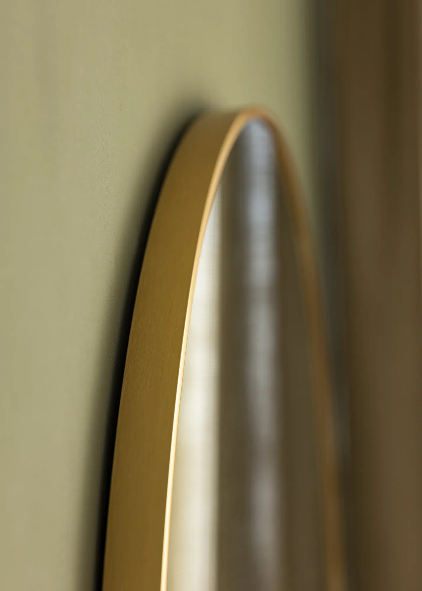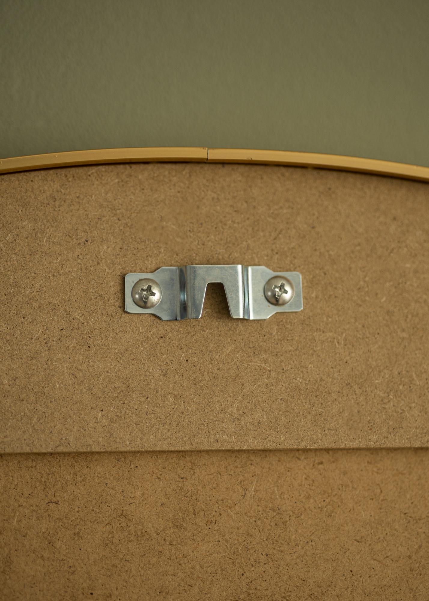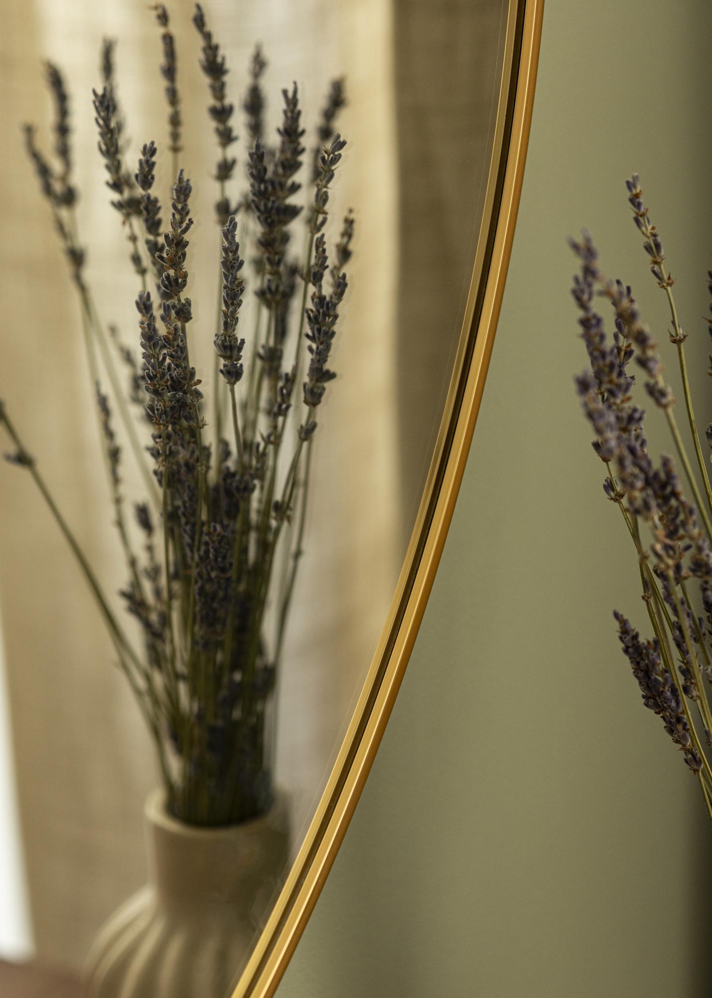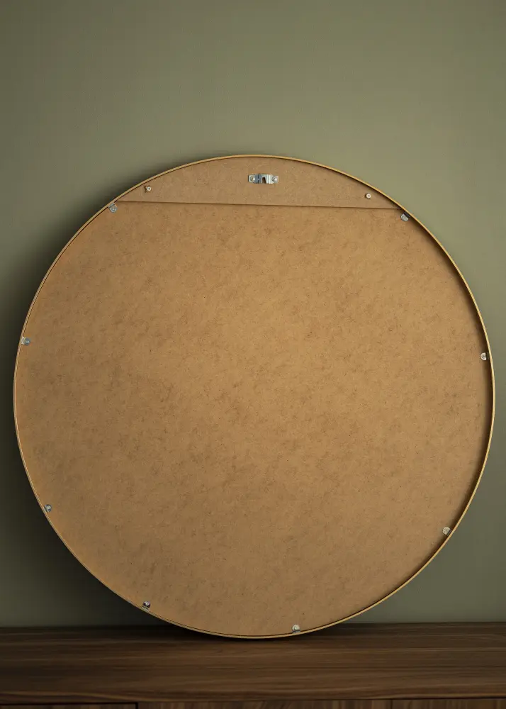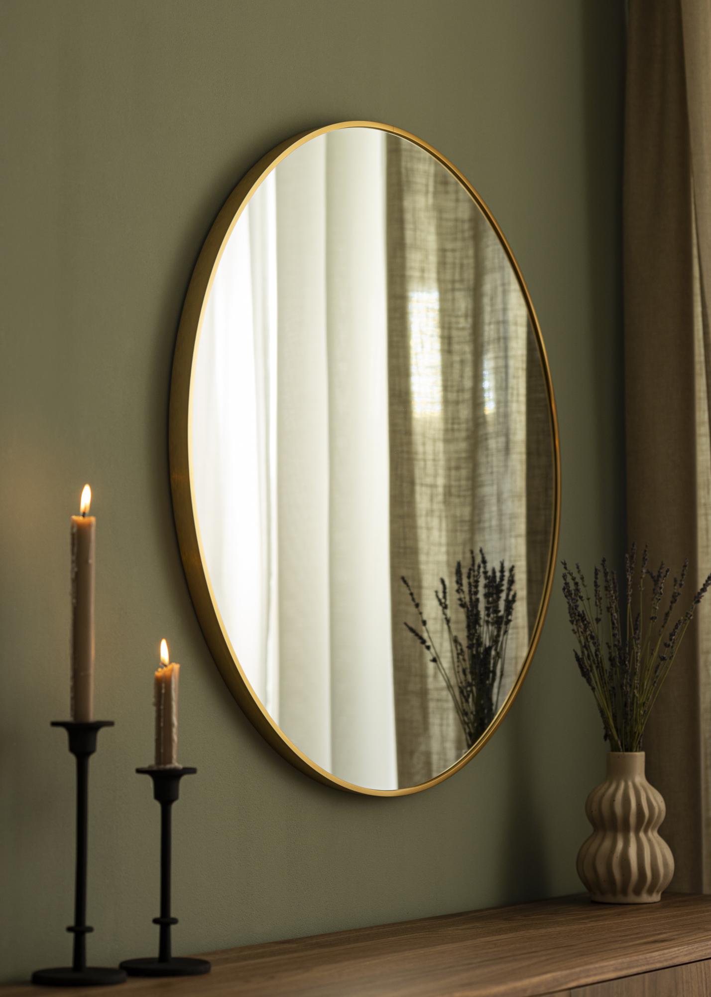 Dieser wandmontierte Spiegel hat eine klassische runde Form, die von einem eleganten, goldfarbenen Aluminiumrahmen umgeben ist. Die Farbe und der Glanz des Rahmens schaffen eine luxuriöse Atmosphäre und werden zu einem Blickfang an jeder Wand. Die runde Form trägt zu einem weichen und harmonischen Gefühl im Raum bei.